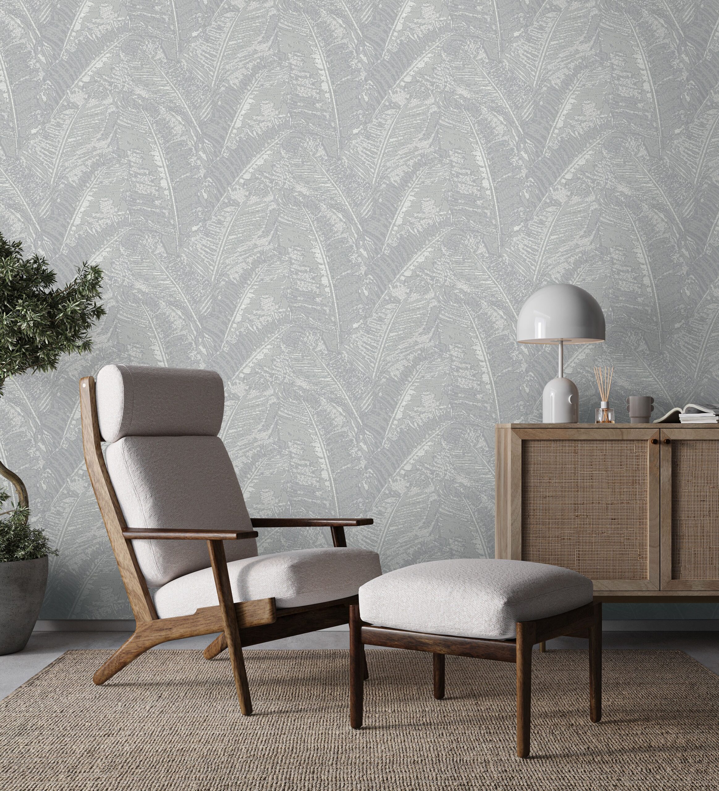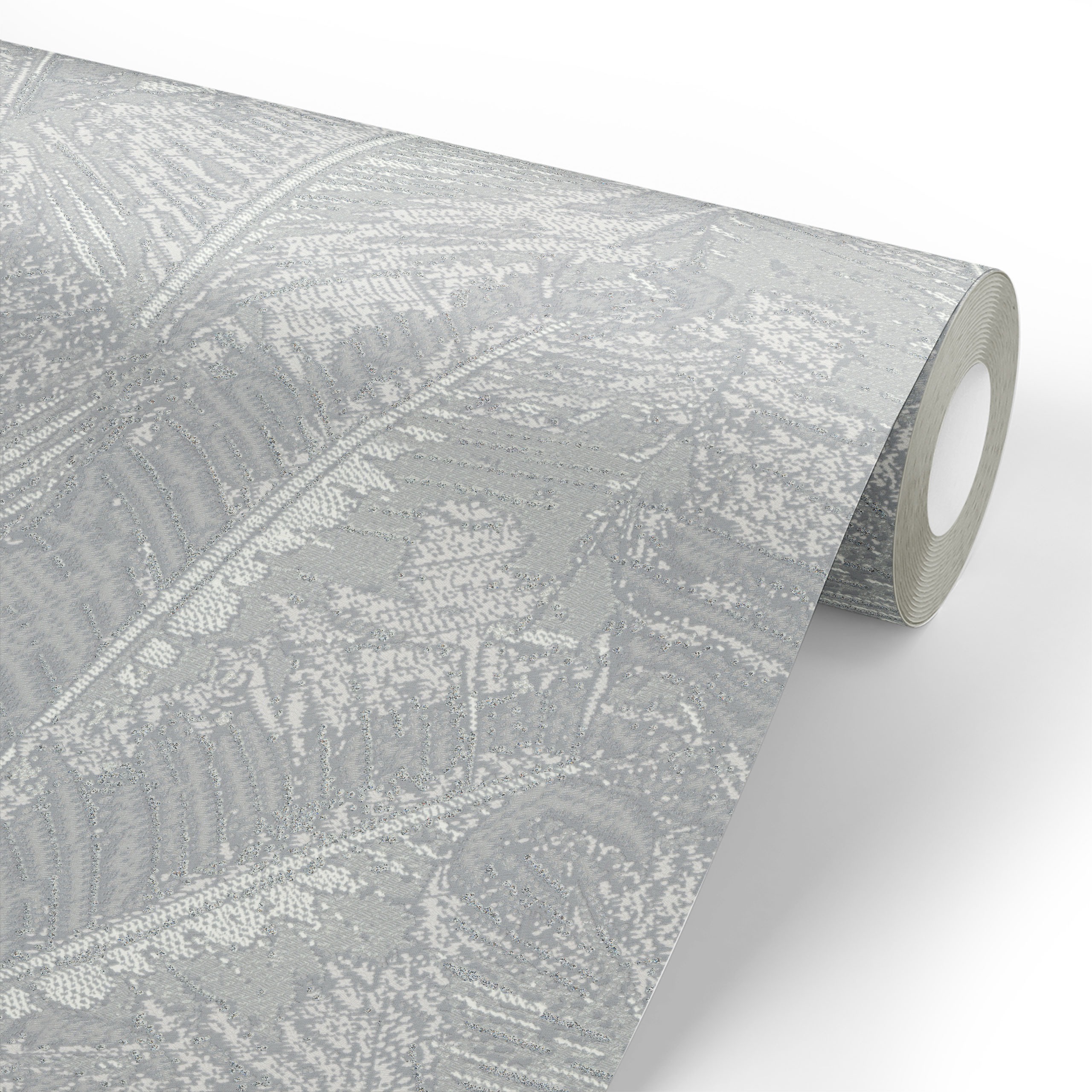 В мотиве представлены крупные листья папоротника. Хаотично раскинувшиеся на полотне, они переплетаются и накладываются друг на друга, образуя многоуровневый рисунок, благодаря чему вся композиция выглядит объемной. Разностороннее тиснение придает растениям естественную природную текстуру. Их стебли выделены контрастным оттенком, а прожилки дополнительно подчеркнуты искрящимся разноцветным глиттером. Создается ощущение, будто капли росы на листьях играют и блестят под ярким солнышком, а вкрапления металлика и переливающегося перламутра усиливают этот эффект. Фон коллекции «Fern» выполнен в спокойных пастельных тонах и имитирует текстуру рогожки, покрытую перламутром. Такое решение поддерживает основной мотив и придает всей коллекции атмосферу уюта и комфорта.