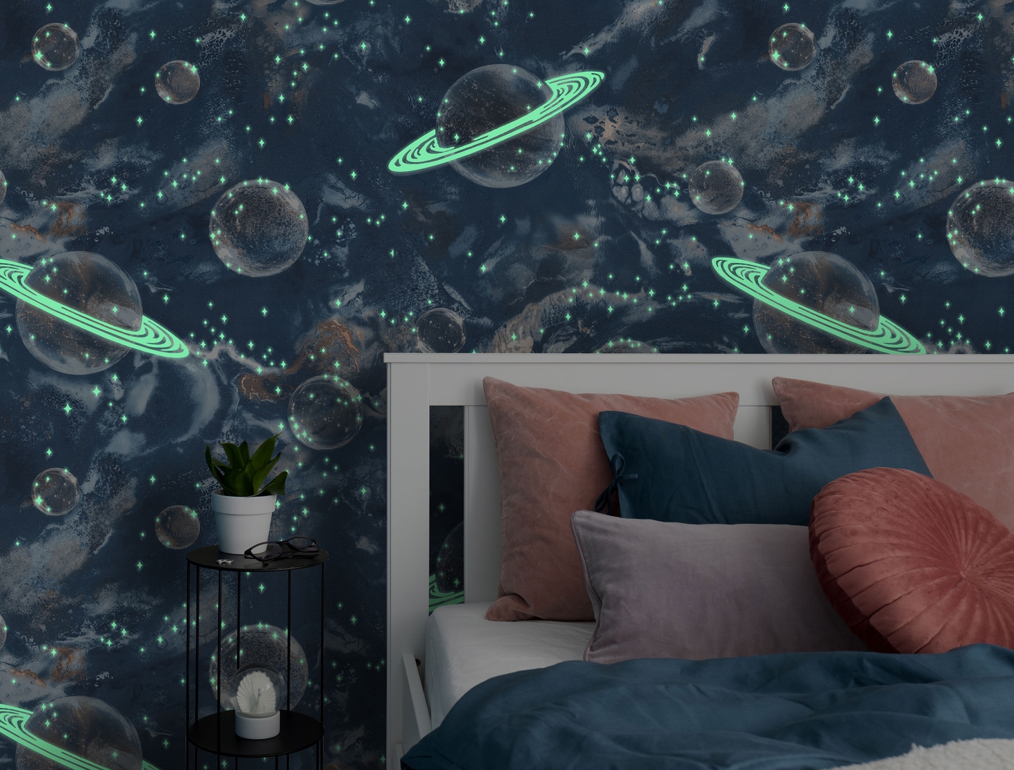 Благодаря специальному люминофорному покрытию, обои, словно губка, впитывают солнечные лучи в течение дня, а с наступлением темноты, они начинают отдавать накопленную энергию, и проявлять на стенах волшебные завораживающие ярко зеленоватые россыпи звезд и планет.