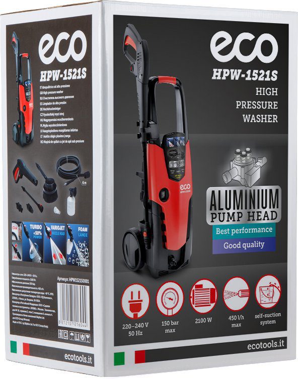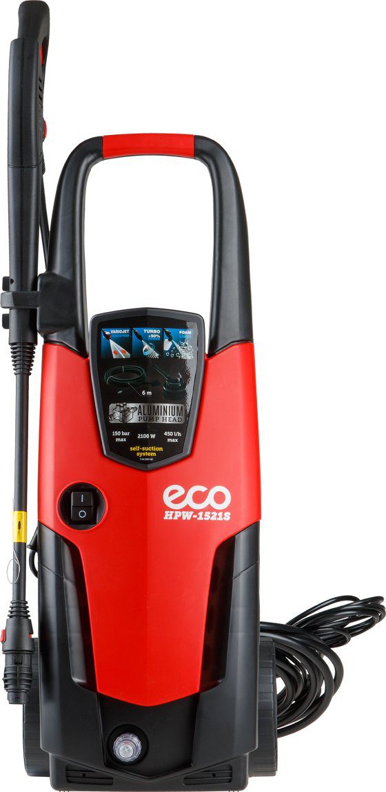 Мойка высокого давления ECO HPW-1521S (HPW1521S0001) имеет алюминиевый корпус насоса с аксиальнопоршневым механизмом. Функцию самовсасывания позволяет использовать очиститель без подключения к водопроводу. Веерная и грязевая форсунки в комплекте. Пеногенератор для распыления моющей пены. Вращающаяся щетка для механической очистки колесных дисков.