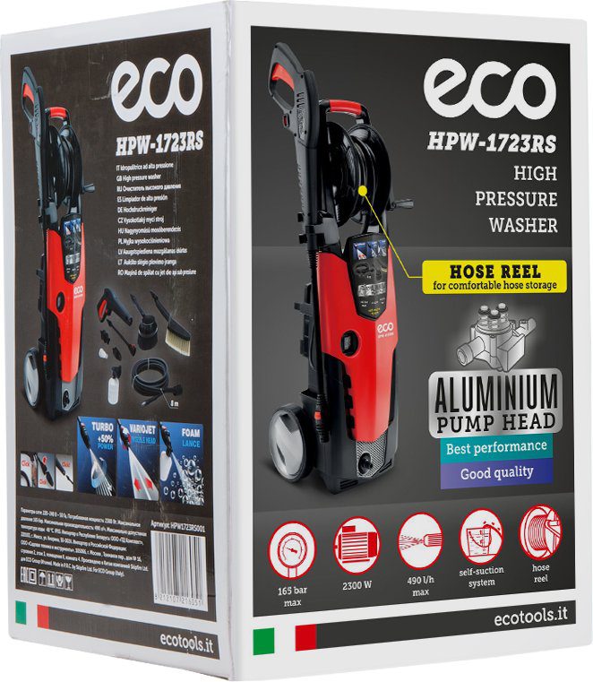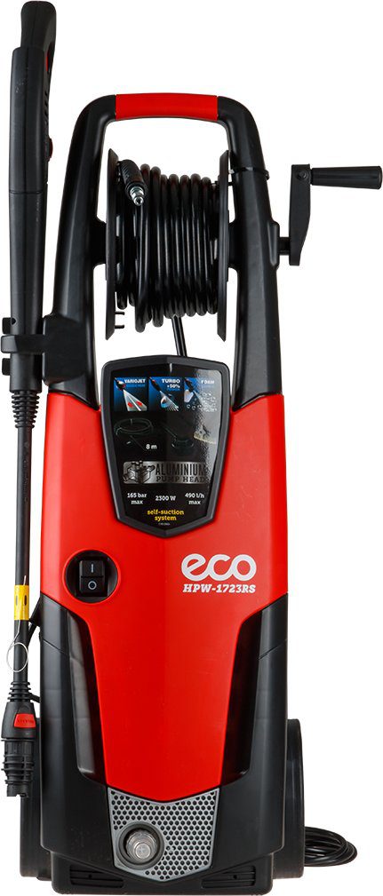 Мойка высокого давления ECO HPW-1723RS (HPW1723RS001) имеет алюминиевый корпус насоса высокого давления. Функцию самовсасывания позволяет использовать очиститель без подключения к водопроводу. Веерная и грязевая форсунки в комплекте. Пеногенератор для распыления моющей пены. Барабан для хранения шланга высокого давления. Стандартная моющая щетка для механической очистки загрязнений. Вращающаяся щетка для механической очистки колесных дисков.