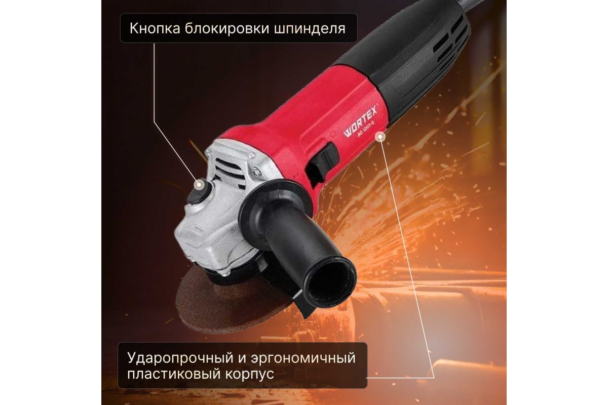 Ударопрочный и эргономичный пластиковый корпус придает уверенности в работе и обеспечивает комфортную эксплуатацию инструмента. В комплекте с УШМ идут 5 отрезных кругов WORTEX 125х1.2х22.2 мм в подарок!