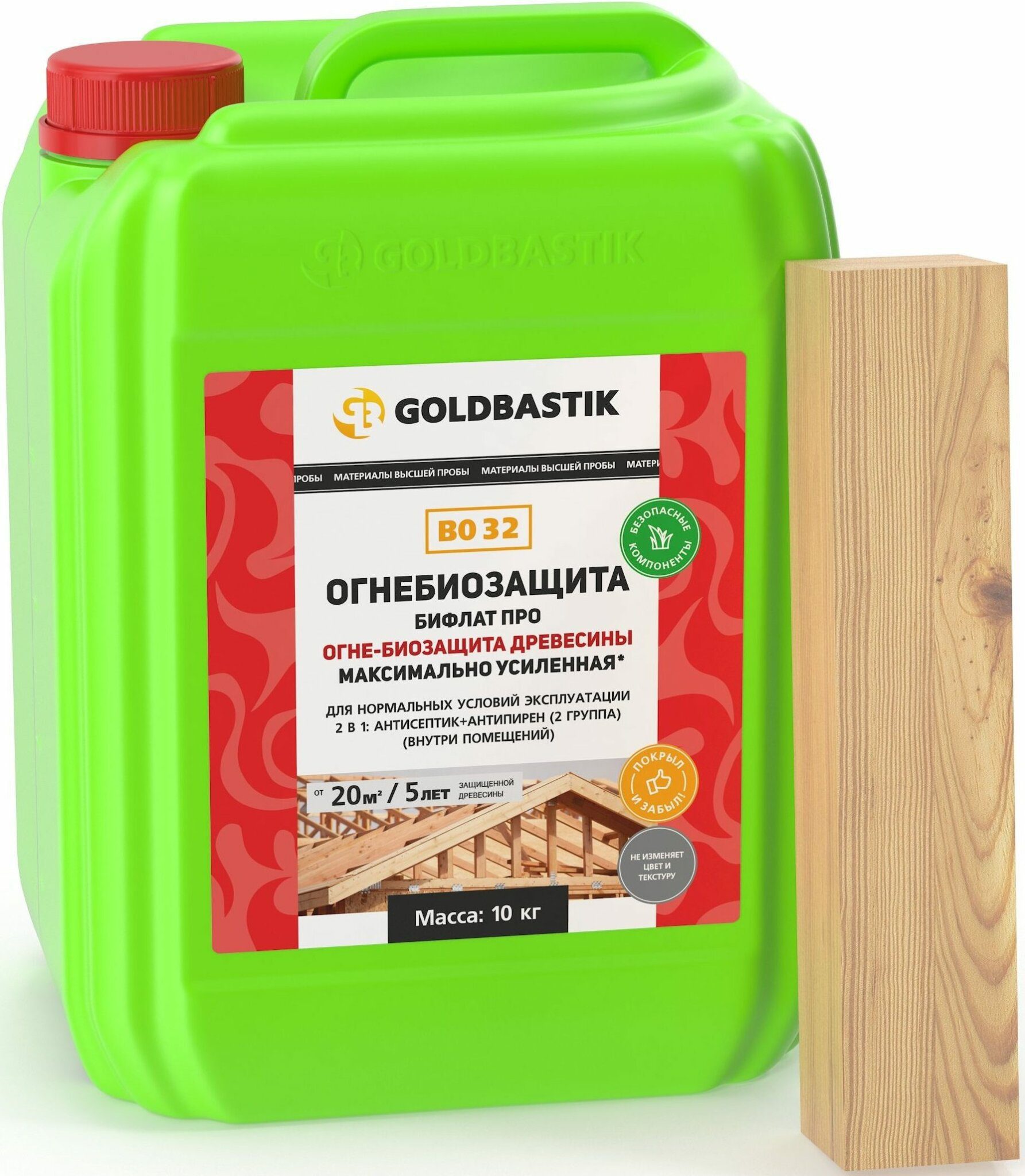 Антисептик GOLDBASTIK Бифлат Про 10 кг (BO 32) – комбинированное био-, огнезащитное средство с максимально усиленным огнезащитным действием* для профессиональной защиты деревянных конструкций от возникновения и распространения пламени, а также гниения, плесени, синевы, насекомых- древоточцев в нормальных условиях эксплуатации (гигроскопическое и конденсационное увлажнение, без контакта с атмосферными осадками). Применяется внутри помещений, устойчиво к старению.