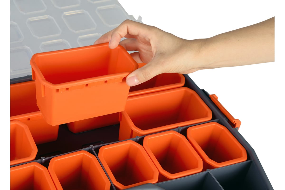 Съёмные переставные внутренние лотки трёх размеров делают удобным размещение внутри органайзера деталей, которые необходимо отделить друг от друга. Глубина лотков позволяет хранить и переносить больший, по сравнению с классическими органайзерами, объём метизов.