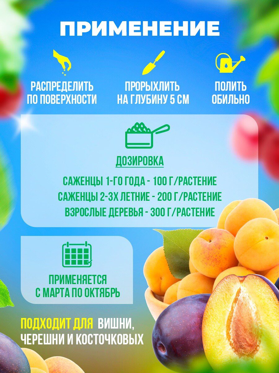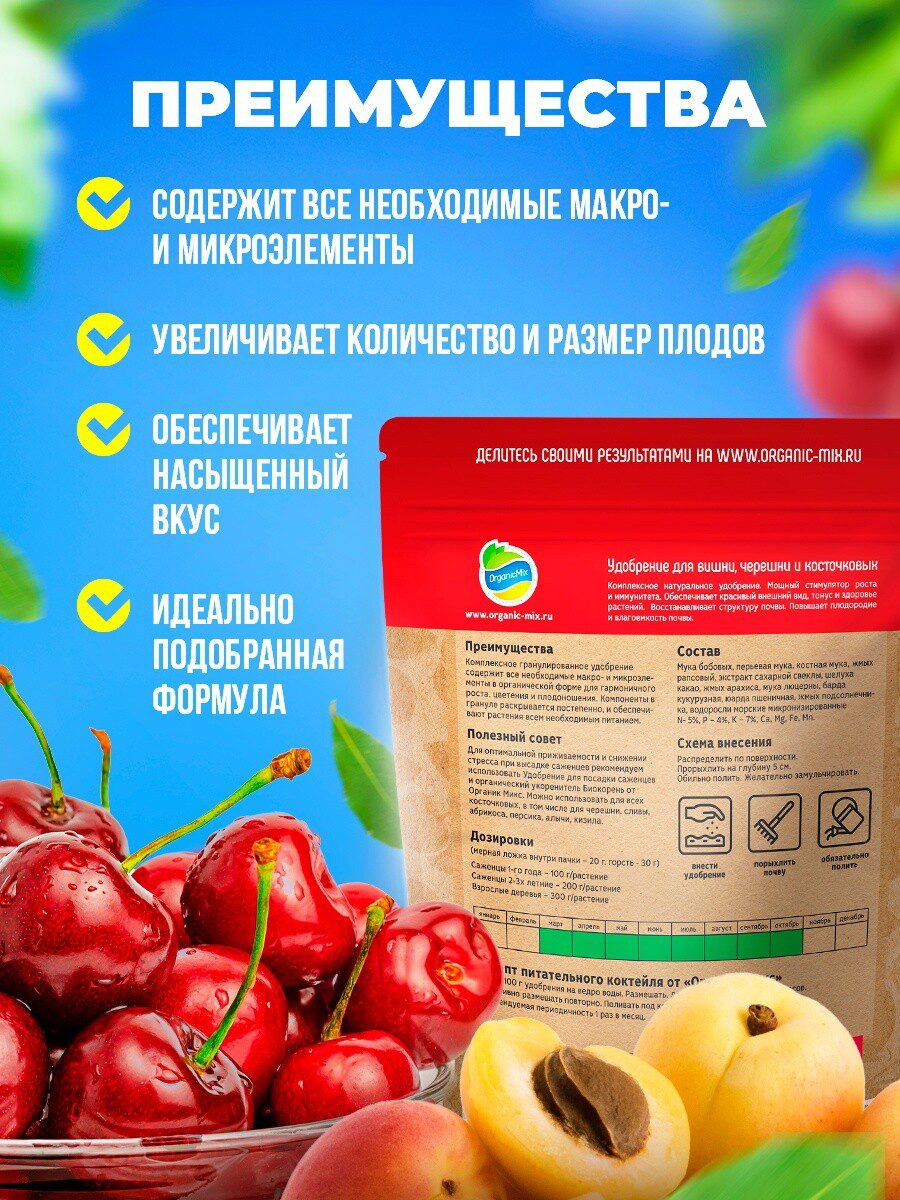 Удобрение ОРГАНИК МИКС для косточковых ЧерриГарден 850 г (4620109891000) – это комплексное гранулированное удобрение пролонгированного действия, содержащее все необходимые макро- и микроэлементы в органической форме для богатого урожая и насыщенного вкуса плодов. Благодаря почвенным микроорганизмам, компоненты в грануле раскрываются постепенно и обеспечивают растения всем необходимым питанием.Преимущества:1. 100% натуральный сбалансированный состав, подобранный с учетом биологической особенности культуры.2. Увеличивают урожайность.3. Ускоряют сроки созревания.4. Увеличивают количество и размер плодов.5. Обеспечивают насыщенный вкус.6. Повышают количество витаминов в плодах.7. Стимулируют рост и развитие, иммунитет, а также увеличивают сопротивляемость и устойчивость к болезням.8. Снижает воздействие стресса от неблагоприятных условий и вредителей.9. Обеспечивают красивый внешний вид и тонус.10. Улучшают структуру и влагоемкость почвы.11. Повышают плодородие почвы.Применяется в качество основного комплексного питания на протяжении всего жизненного цикла для следующих плодовых деревьев: вишня, черешня, слива, абрикос, персик, нектарин, алыча, кизил, черемуха и других косточковых.Состав: мука бобовых, перьевая мука, костная мука, жмых рапсовый, экстракт сахарной свеклы, шелуха какао, жмых арахиса, мука люцерны, барда кукурузная, юарда пшеничная, жмых подсолнечника, водоросли морские микронизированные. N – 5%, P – 4%, K – 7%, Ca, Mg, Fe, Mn.Дозировки: Саженцы 1-го года – 100 г/растение; Саженцы 2-3х летние – 200 г/растение; Взрослые деревья – 300 г/растение.Периодичность внесения – 1 раз в 30-45 дней.Сезонность применения: с апреля по октябрь.Схема внесения: распределить по поверхности почвы, далее прорыхлить на глубину 5 см, обильно полить и желательно замульчировать.Рецепт питательного коктейля для быстрой подкормки: добавить 100 г удобрения на 10 л воды и размешать. Настоять от 8 до 24 часов. Перед внесением тщательно размешать и поливать под корень из расчета 3-5 литров на 1 м². Рекомендуемая периодичность 1 раз в 30 дней.