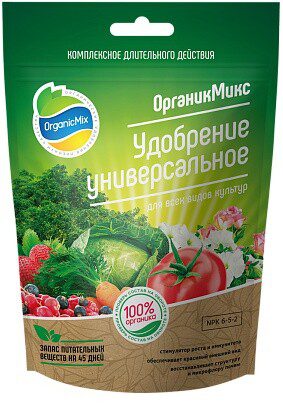 Удобрение универсальное ОРГАНИК МИКС 850 г – это комлексное гранулированное органическое удобрение, содержащее все необходимые макро- и микроэлементы для роста и развития растений. Благодаря почвенным бактериям натуральные компоненты в грануле раскрываются постепенно и обеспечивают растение питанием в течение 45 дней. Преимущества данного удобрения:1. Оптимально подобранный сбалансированный состав.2. Увеличивает урожайность.3. Повышает содержание витаминов и антиоксидантов.4. Значительно улучшает вкус и размер плодов.5. Уменьшает потребность в поливе.6. Восстанавливает плодородие почву.7. Простота и удобство внесения.8. Пролонгированный эффект.Состав: ферментированная мука бобовых, перьевая мука, рыбная костная мука, костная мука обезжиренная, жмых рапсовый, меласса, экстракт сахарной свеклы, шелуха какао, жмых кофе, жмых арахиса, мука люцерны, барда кукурузная, барда пшеничная, пивная дробина, водоросли морские микронизированные. N – 6%, P – 5%, K – 2%, Ca , Mg, S, Zn, Fe, B, Mo.Дозировки: Цветы – 50-100 г/м²; Кустовые цветы – от 50 г/м²; Хвойные – 50-100 г/м²; Газон – 50 г/м²; Ягодные кустарники – 100 г/куст; Виноград – 100 г/куст; Овощные – 50-100 г/м²; Плодовые и косточковые деревья – от 200 г/м²; Внесение на грядки при посеве семян – 100 г/м².Периодичность внесения – 1 раз в 30-45 дней.Сезонность применения: с марта по октябрь.Схема внесения: распределить по поверхности почвы, далее прорыхлить на глубину 5 см, обильно полить и желательно замульчировать.Рецепт питательного коктейля для быстрой подкормки: добавить 100 г удобрения на 10л воды и размешать. Настоять от 8 до 24 часов. Перед внесением тщательно размешать и поливать под корень из расчета 3-5 литров на 1 м². Рекомендуемая периодичность 1 раз в 30 дней.