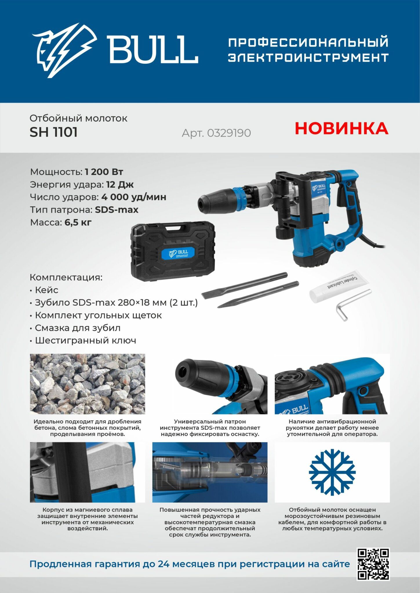 Молоток отбойный BULL SH 1101 (0329190) предназначен для дробления бетона, слома бетонных покрытий, проделывания проёмов. Универсальный патрон инструмента SDS-max позволяет надежно фиксировать оснастку. Наличие антивибрационной рукоятки делает работу менее утомительной для оператора. Корпус из магниевого сплава защищает внутренние элементы инструмента от механических воздействий, а повышенная прочность ударных частей редуктора и высокотемпературная смазка обеспечат продолжительный срок службы инструмента. Кроме того, отбойный молоток оснащен морозоустойчивым резиновым кабелем для комфортной работы в любых температурных условиях.