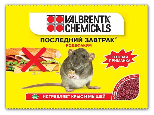 Отрава от грызунов VALBRENTA CHEMICALS Последний завтрак Родефакум рыба 200 г выступает в качестве ароматной зерновой приманки с запахом рыбы. Используется для уничтожения домовой мыши и серой крысы, внутри помещения и прилегающей к нему территории. Препарат готов к применению и не требует дополнительного смешивания с приманочным материалом. Декортицированное зерно, пищевой краситель, натуральные пищевые компоненты. Действующее вещество: Brodifacoum 0,005%, Denatonium Benzoate 0,001%.