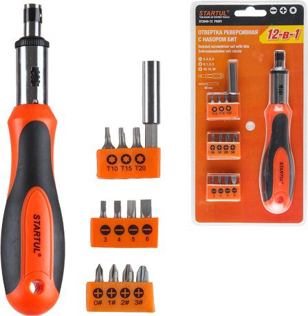 Отвертка реверсивная с набором бит STARTUL Profi 12 предметов (ST3049-12) применяется для монтажа и демонтажа резьбовых соединений. Двухкомпонентная CRV мягкая противоскользящая рукоятка для надежного захвата, отвертка оснащена магнитным наконечником, а также стержнем из хром-ванадиевой стали. Индивидуальный блистер с отверстием под крюк.