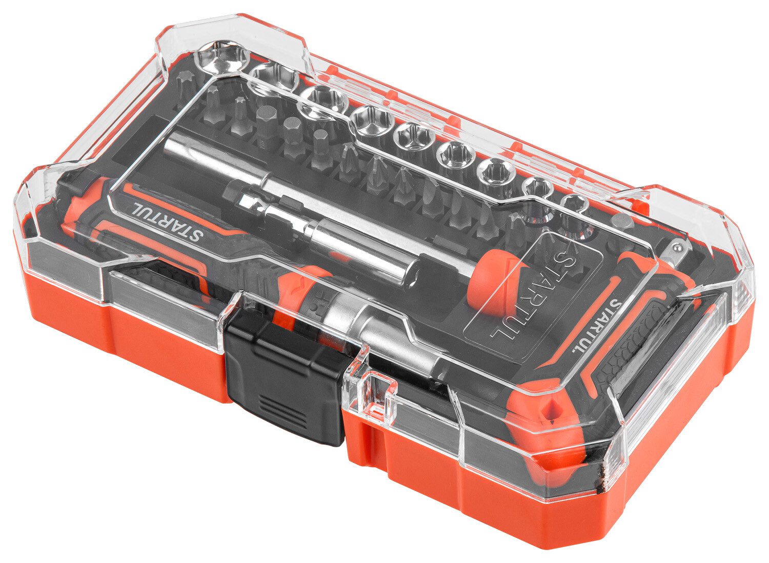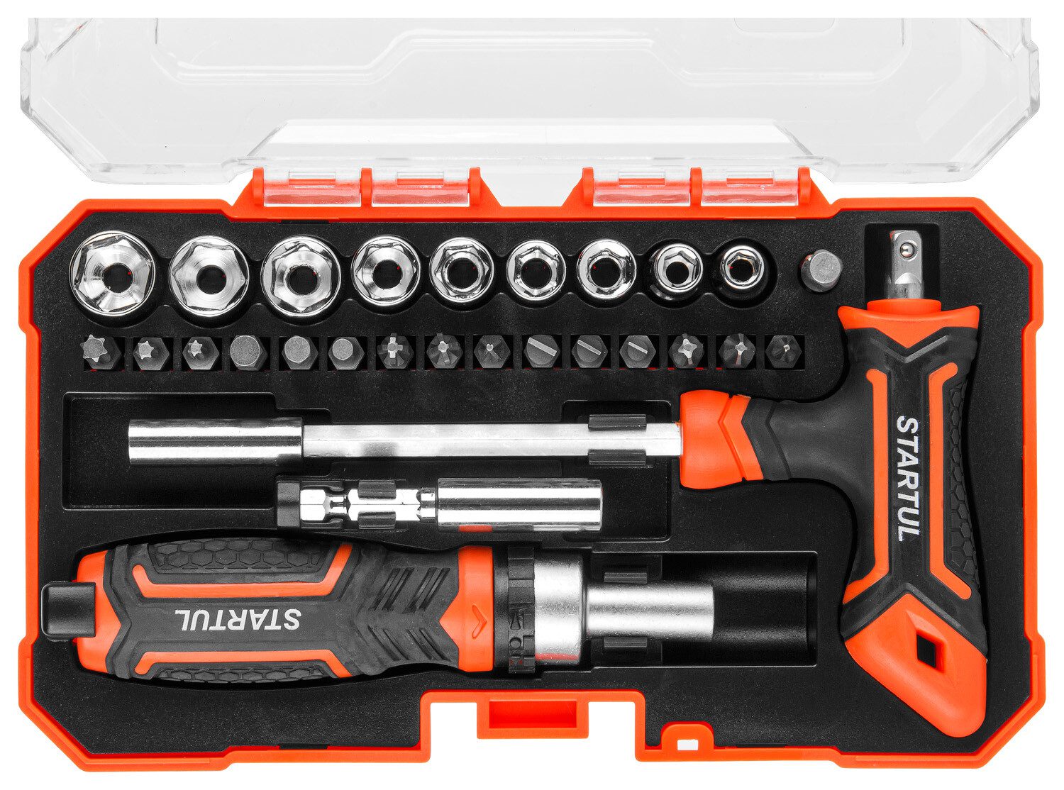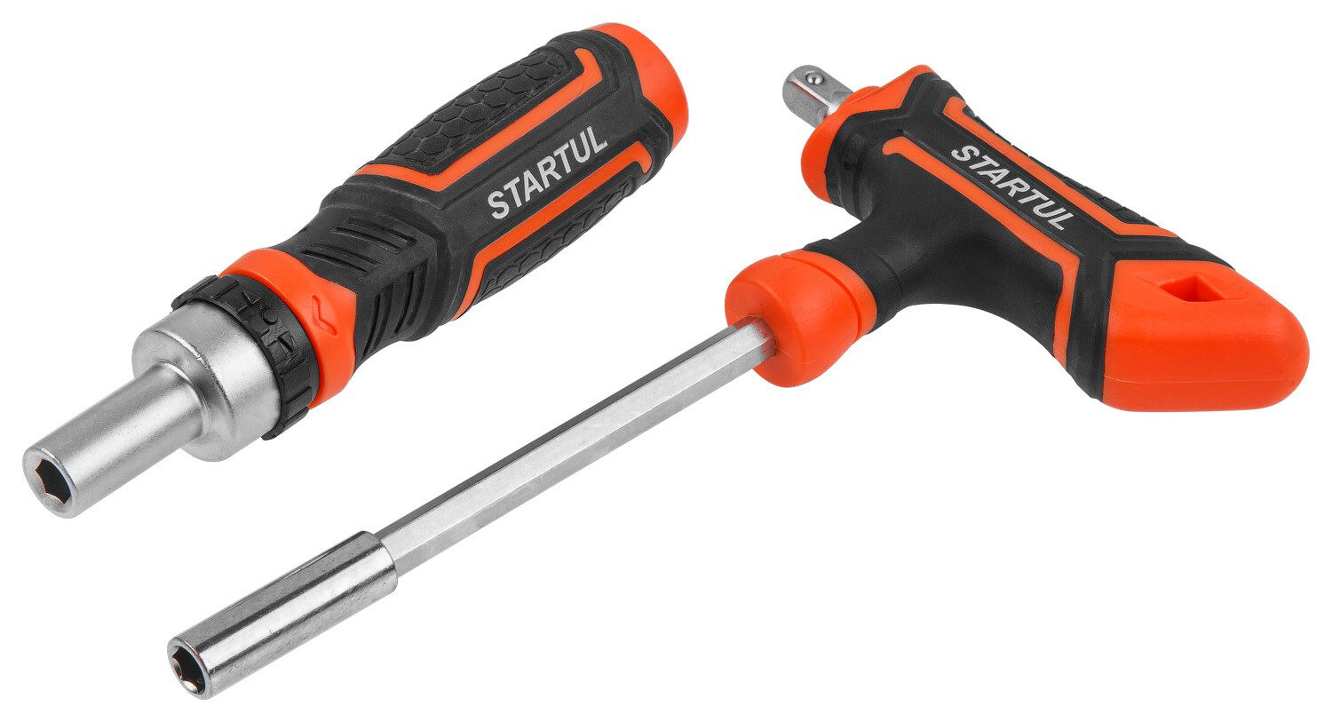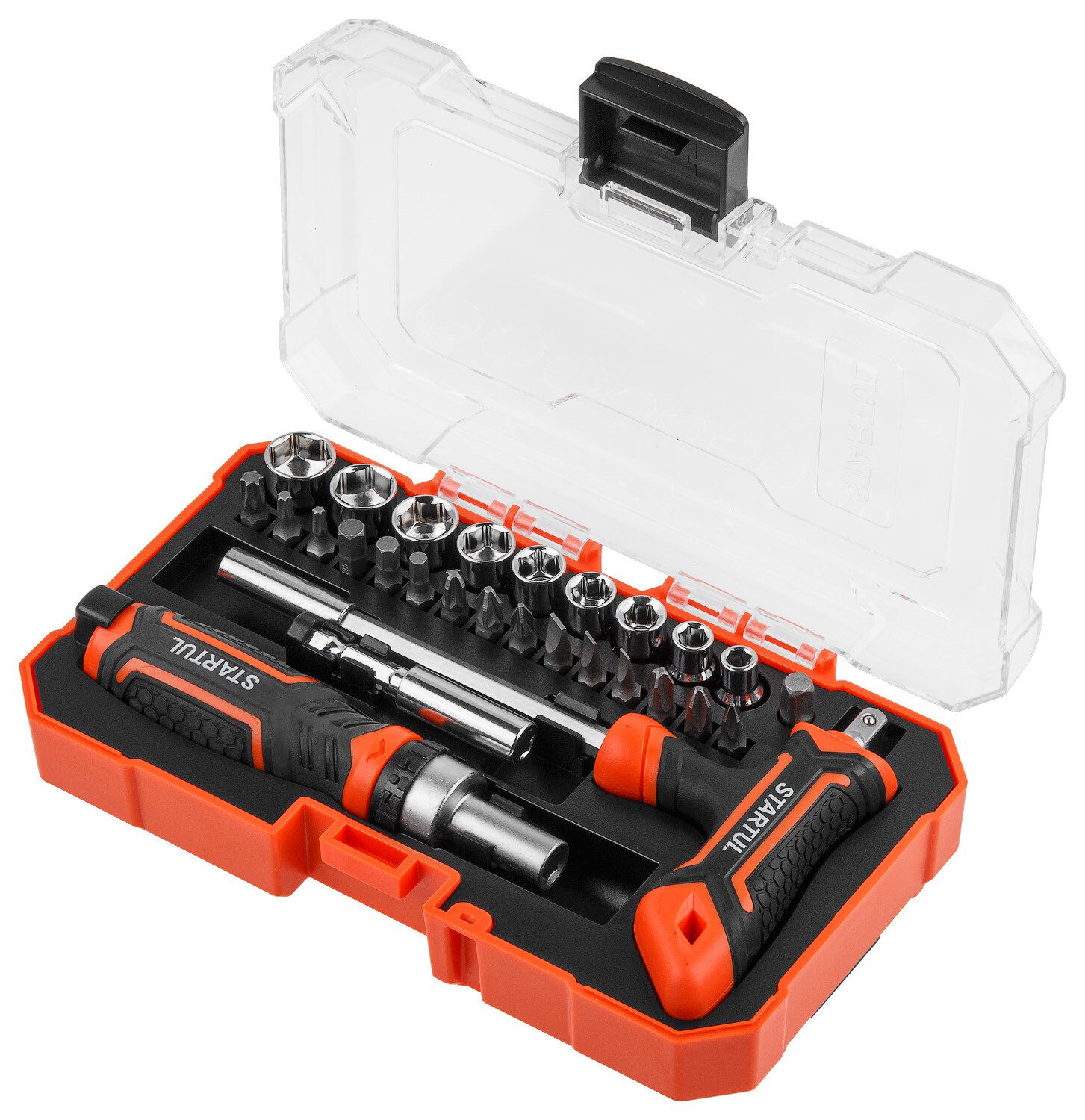Отвертка реверсивная с набором бит и торцевых головок STARTUL Profi 28 предметов (ST3095-28) предназначена для монтажа и демонтажа крепежных элементов. Трещоточный механизм: реверсивный. Биты выполнены из хромованадиевой стали.