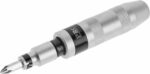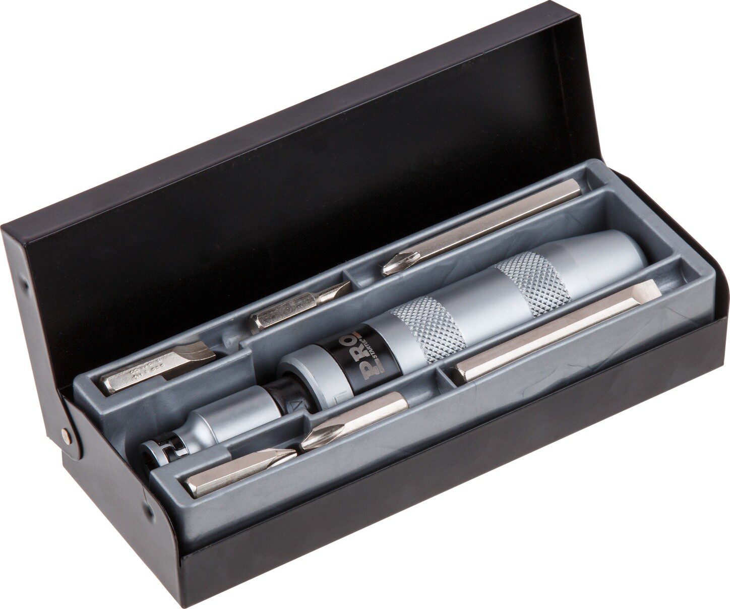 Отвертка ударно-поворотная с набором бит PRO STARTUL 7 предметов (PRO-6057) предназначена для монтажа и демонтажа резьбовых соединений с применением значительных усилий. Посадочным размер бит – 5/16″. Рукоятка металлическая, с рифлением. Упаковка – металлический кейс.