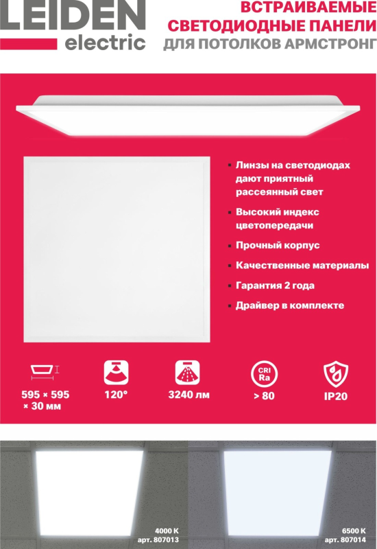 Светильник потолочный светодиодный встраиваемый 36 Вт 6500К LEIDEN ELECTRIC LPRS (807014) предназначен для использования в качестве основного и дополнительного освещения административных, технических, вспомогательных, жилых и других помещений. Прочный эстетичный корпус впишется в любой интерьер. При создании светильника были использованы только качественные материалы. Приятный рассеянный свет, благодаря линзам на светодиодах, с высоким индексом цветопередачи позволяет комфортно чувствовать себя внутри помещений. Драйвер в комплекте позволяет подключить светильник напрямую к сети 230В. Благодаря стандартным размерам и малой высоте светильник можно смонтировать практически на любые потолки типа Армстронг.