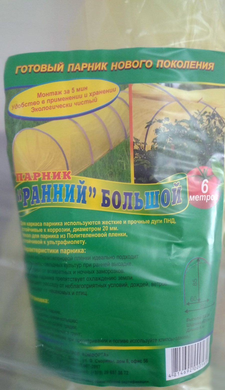 Парник ОСТРОВ КОМФОРТА Ранний 6 м (4814692000561) для защиты рассады и овощных культур от воздействия неблагоприятных климатических условий при выращивании на дачных и приусадебных участках. Чехол на парник из пленки спаян на специальном станке. Петля для установки трубы 5×5 см. Спай выдерживает любую ветровую нагрузку. Штырь – конусообразный, 8 ребер жесткости, принцип “Акулий зуб”. Зажим диаметром 20 мм (2шт на трубу). Чехол из пленки устойчивый к ультрафиолету.