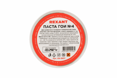 Паста ГОИ полировальная № 4 REXANT (09-3807) абразивный материал светло-зелёного цвета с зернистостью 40–18 мкм и высоким содержанием абразива (до 85%). Предназначена для получения матовой поверхности и устранения мелких дефектов. Эффективна при предварительной обработке металлов, стекла и других твёрдых материалов.