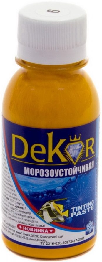 Колер DEKOR №6 апельсиновый 0,1 кг универсальная колеровочная паста предназначена для тонирования эмалей, масляных красок, лаков, водно-дисперсионных красок, растворов и других составов. Паста совместима с красками любых производителей. Имеет ряд преимуществ: проста в применении, обладает широкой цветовой гаммой, универсальна, не высыхает, имеет длительный срок хранения.