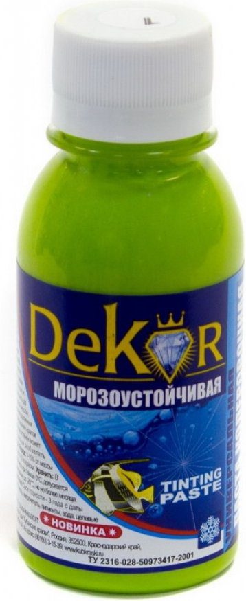 Колер DEKOR №1 лимонно-желтый 0,1 кг универсальная колеровочная паста предназначена для тонирования эмалей, масляных красок, лаков, водно-дисперсионных красок, растворов и других составов. Паста совместима с красками любых производителей. Имеет ряд преимуществ: проста в применении, обладает широкой цветовой гаммой, универсальна, не высыхает, имеет длительный срок хранения.