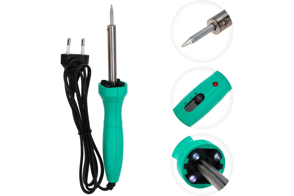 Главное преимущество: LED подсветка, состоящая из 4-х светодиодов, находящихся в нижней части рукоятки. Подсветка обеспечит всестороннюю бестеневую подсветку места пайки. Долговечное жало паяльника состоит из медьсодержащего сердечника, покрытого слоем электролитически осажденного железа, отличающегося высокой стойкостью к коррозии. При соблюдении ряда предосторожностей жало способно работать длительное время без утраты эксплуатационных свойств. В случае необходимости его можно легко и быстро заменить (сменное жало в комплект не входит).