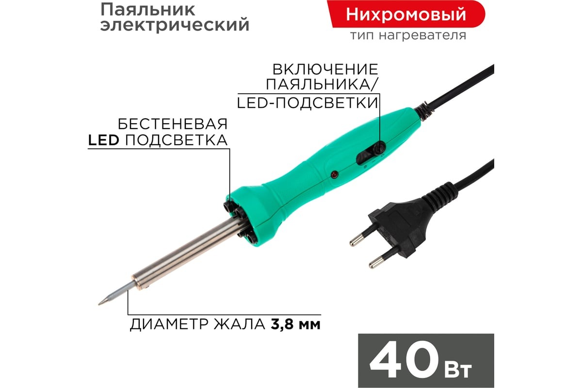 Паяльник с нагревателем долговечное жало 220 В/40 Вт LED подсветка | 12-0138 | REXANT