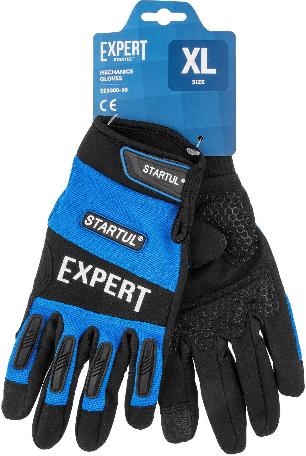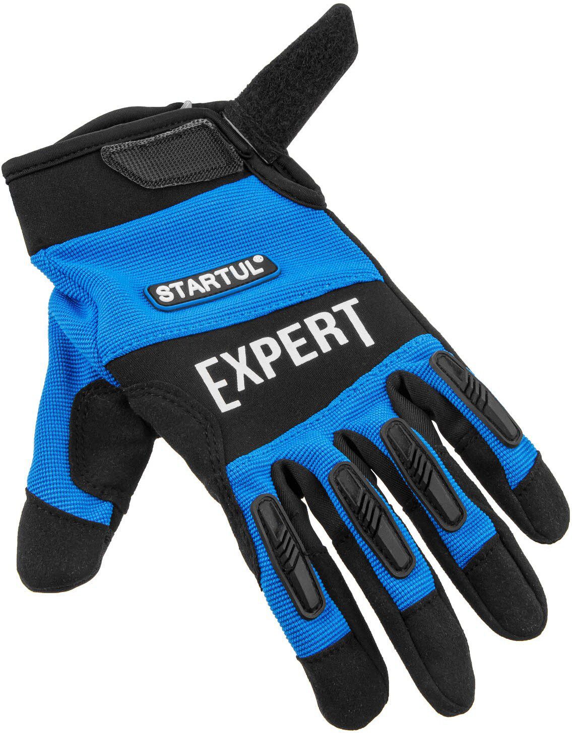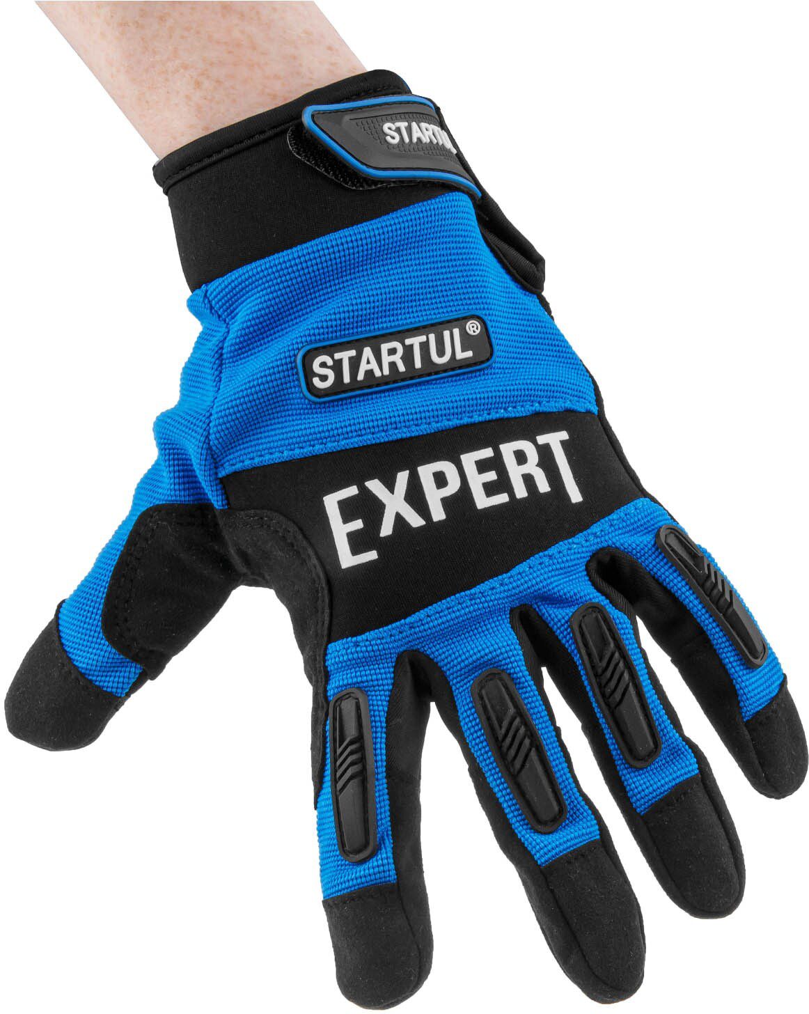 Перчатки для монтажных работ STARTUL Expert размер 10 XL (SE5000-10) — прочные перчатки из качественных и долговечных синтетических материалов. TPR-накладки на пальцах перчатки защищают руку от удара. Воздухопроницаемый материал на тыльной стороне обеспечивает вентиляцию руки. Вставки на ладони снижают воздействие низкочастотных колебаний (вибраций). Сенсорные вставки на кончиках пальцев (большого и указательного) позволяют пользоваться смартфоном, не снимая перчаток. Прочная застежка-напульсник на липучке обеспечивает удобную подгонку и надежную фиксацию перчатки на руке.