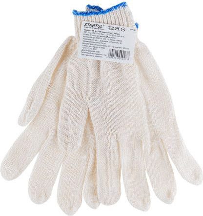 Перчатки хлопчатобумажные размер 9 STARTUL (ST7190) только для защиты от минимальных рисков.Состав: 60% хлопок + 40% полиэфир.Количество нитей: 4-ниточные;Цвет белая пряжа, оверлок машинный белый.Вес одной пары 39 гр.