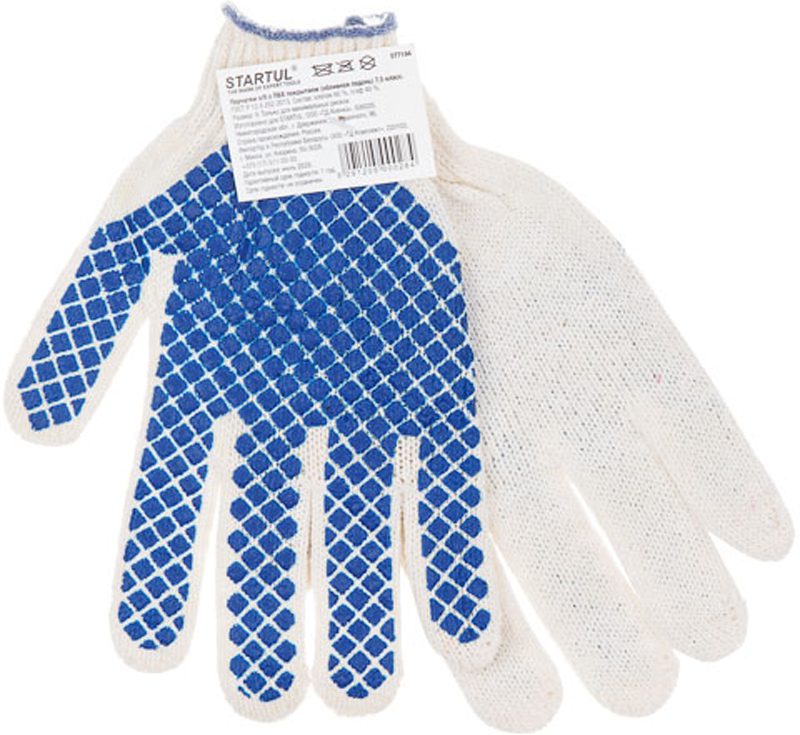 Перчатки хлопчатобумажные с ПВХ покрытием STARTUL размер 9 (ST7194) предназначены для защиты от минимальных рисков. Благодаря покрытию из ПВХ создают отличное сцепление со скользкими поверхностями. Состав: 60% хлопок, 40% полиэфир. Класс вязки: 7,5. Количество нитей: 4-ниточные. ПВХ-покрытие: “шахматный облив” на ладонной части. Цвет: белая пряжа с синим покрытием. Оверлок: машинный белый. Вес одной пары: 45 г.