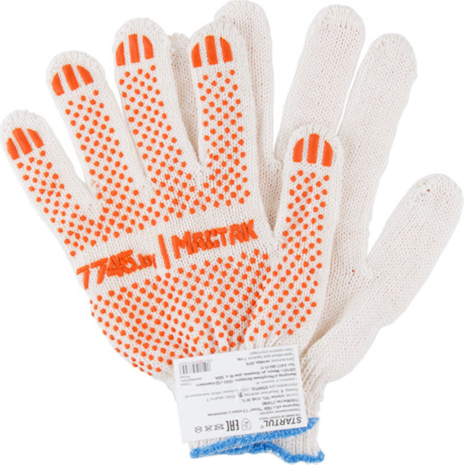 Перчатки хлопчатобумажные с ПВХ точечным покрытием STARTUL с логотипом 7745/Мастак (7745MA) предназначены для защиты рук от истирания и механических воздействий. Благодаря покрытию из ПВХ создают отличное сцепление со скользкими поверхностями. Мягкая текстура не сковывает движение рук. Рекомендуется использовать в сухих условиях при выполнении погрузочно-разгрузочных, фасовочных и легких монтажных работ. Универсальные. Состав: 60% хлопок + 40% полиэфир. Количество нитей: 4-ниточные. Вид покрытия: ПВХ-покрытие на ладонной части. Цвет: белая пряжа с ПВХ-покрытием оранжевого цвета. Оверлок: машинный синий/оранжевый.Защита: только для защиты от минимальных рисков.