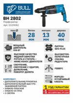 Перфоратор BULL BH 2802 (0329082) имеет 4 режима работы: сверление, сверление с ударом, долбление, а также режим поворота долота. Переключение между режимами осуществляется с помощью специального переключателя. Мощный двигатель перфоратора обеспечивает высокую производительность инструмента. Наличие патрона SDS-plus в перфораторе позволяет сменить оснастку легко и быстро. Перфоратор оснащен функцией реверса для легкого выкручивания сверла из материала.