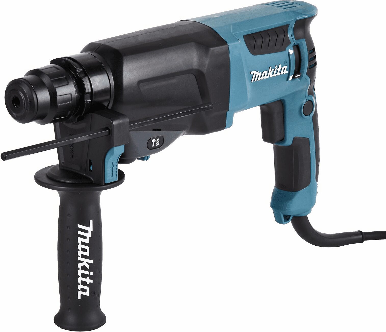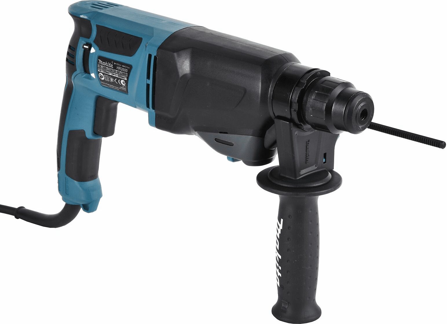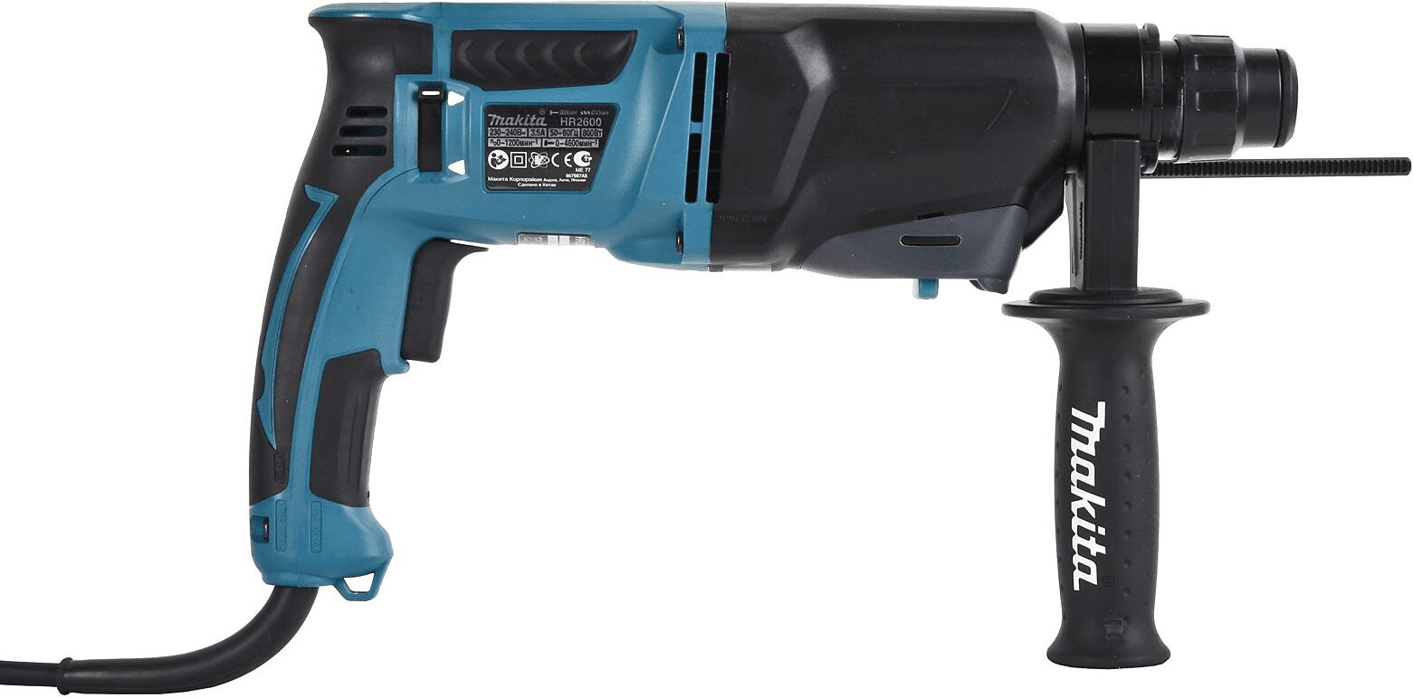 Перфоратор MAKITA HR 2600 (HR2600) предназначен для использования в условиях интенсивной работы на строительной и производственной площадках. Служит для изготовления отверстий в бетоне до 26 мм (max d сверления в бетоне коронкой: 68 мм, max d сверления в бетоне алмазной коронкой: 80 мм), стали до 13 мм и дереве до 32 мм. Перфоратор имеет два режима работы: сверление, сверление с ударом, а также расцепляющую муфту предотвращающую рывок перфоратора при заклинивании бура в момент работы и реверс. Рукоятка и корпус редуктора с мягкой резиновой накладкой обеспечивает полный контроль. Перфоратор адаптирован под хвостовик SDS-Plus. Мощность выходная: 400 Вт. Max выходная мощность: 550 Вт. Крепление дополнительной рукоятки: Шейка d 50 мм. Длина: 36,1 см. Длина кабеля: 4 м.