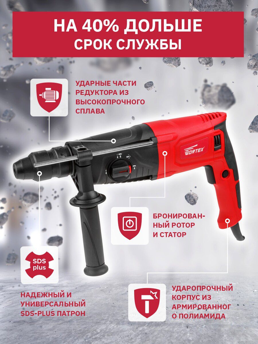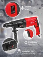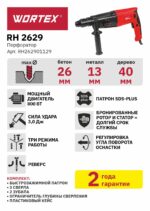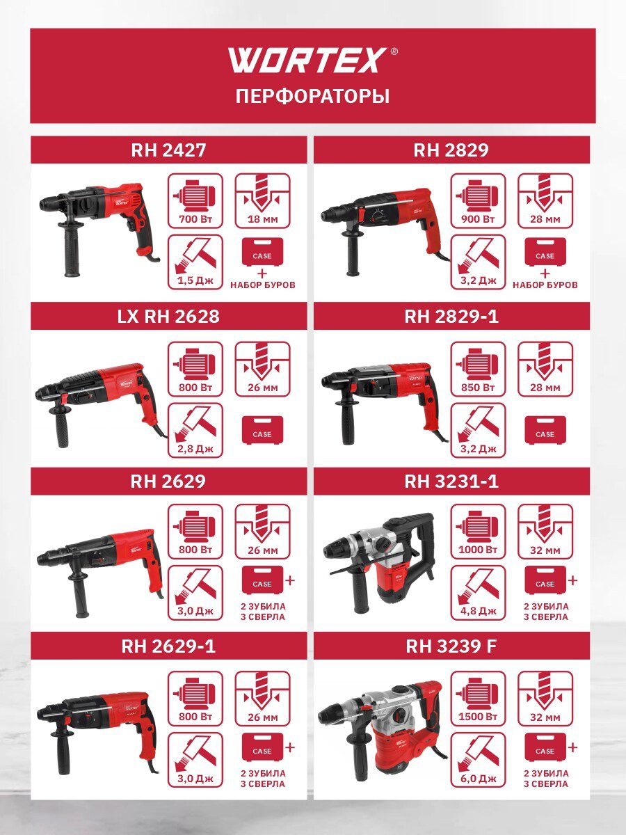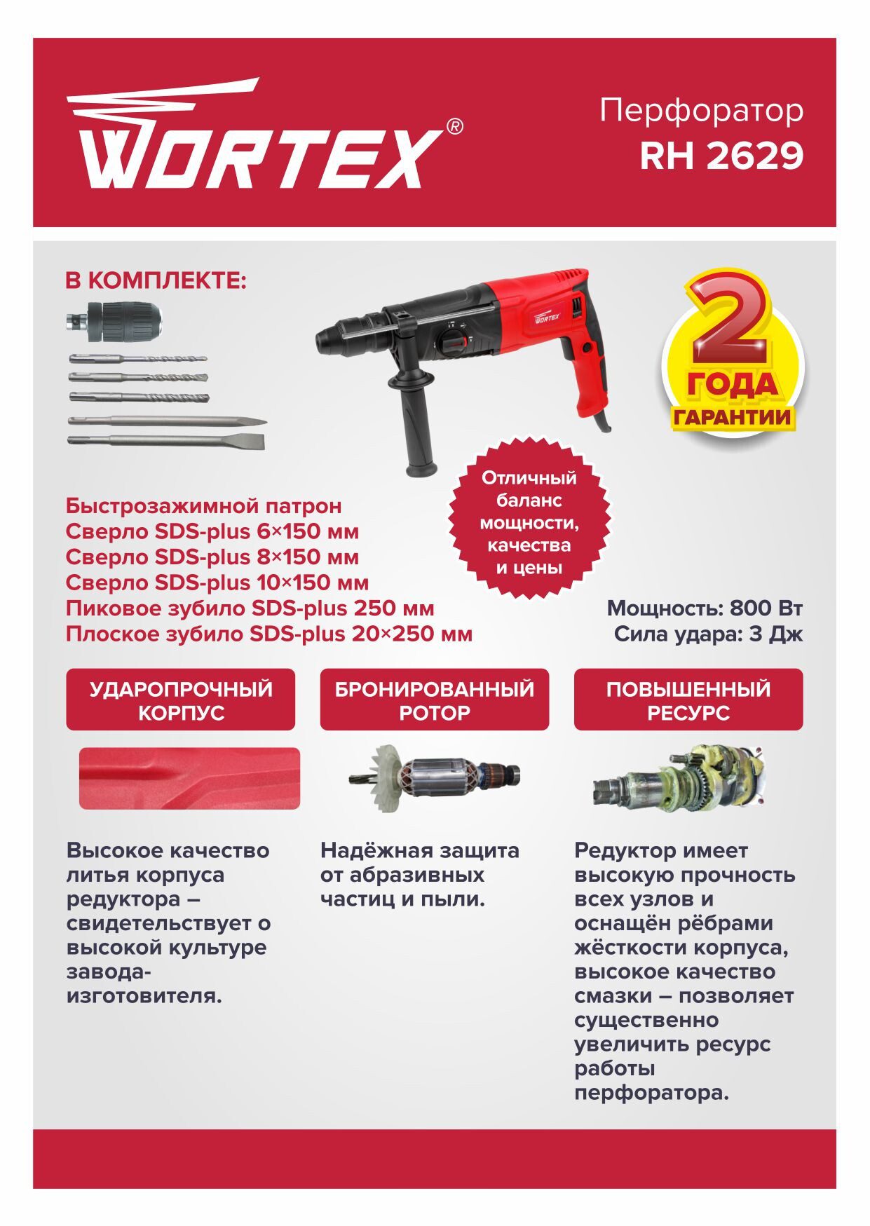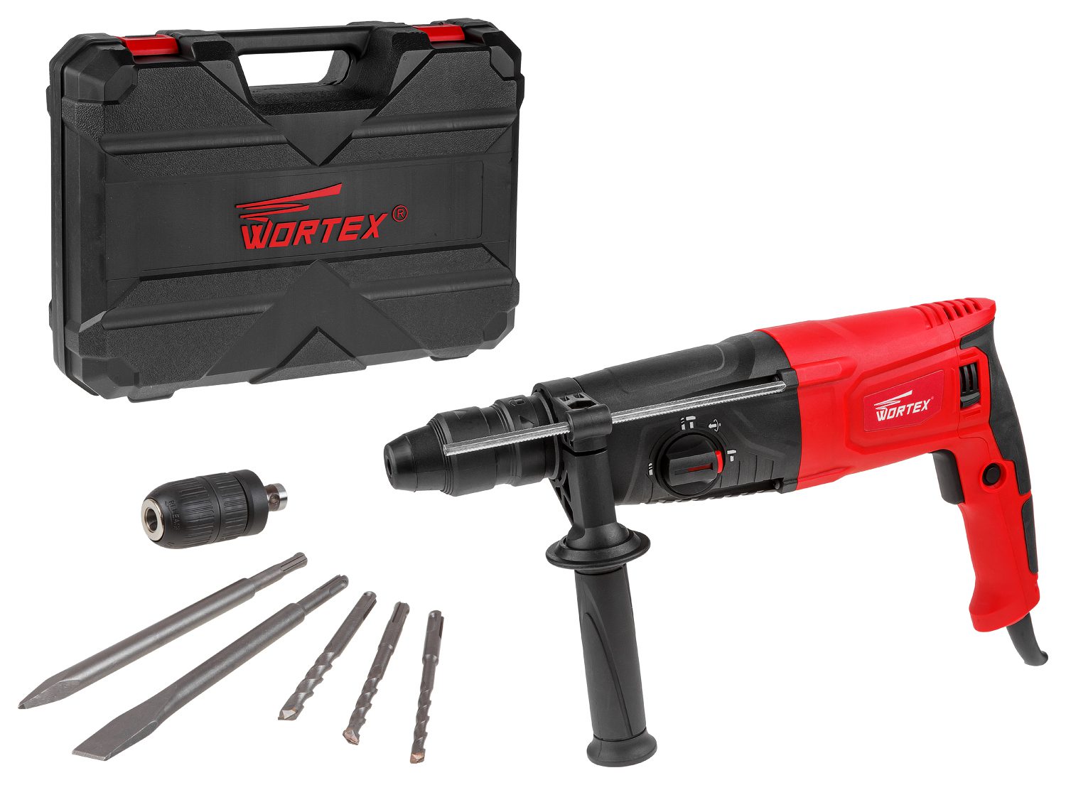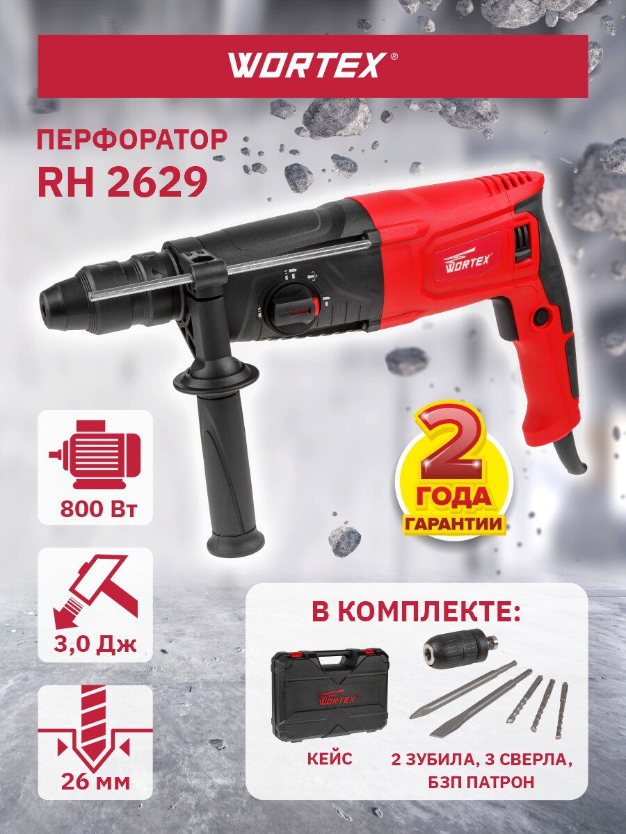 Перфоратор WORTEX RH 2629 (RH262901129) оснащен функцией регулировки угла оснастки. Высокая скорость при сверлении и высокая производительность при долблении осуществляется благодаря двигателю в 800 Вт и энергии удара 3,0 Дж. Перфоратор может осуществлять 3 вида работы: сверление, сверление с ударом, долбление. Быстрорегулируемая эргономичная рукоятка легко настраивается в любом нужном положении. В комплект поставки входит: 3 сверла: 6х150 мм, 8х150 мм, 10х150 мм; 2 зубила: пиковое 230 мм и плоское 20х250 мм.