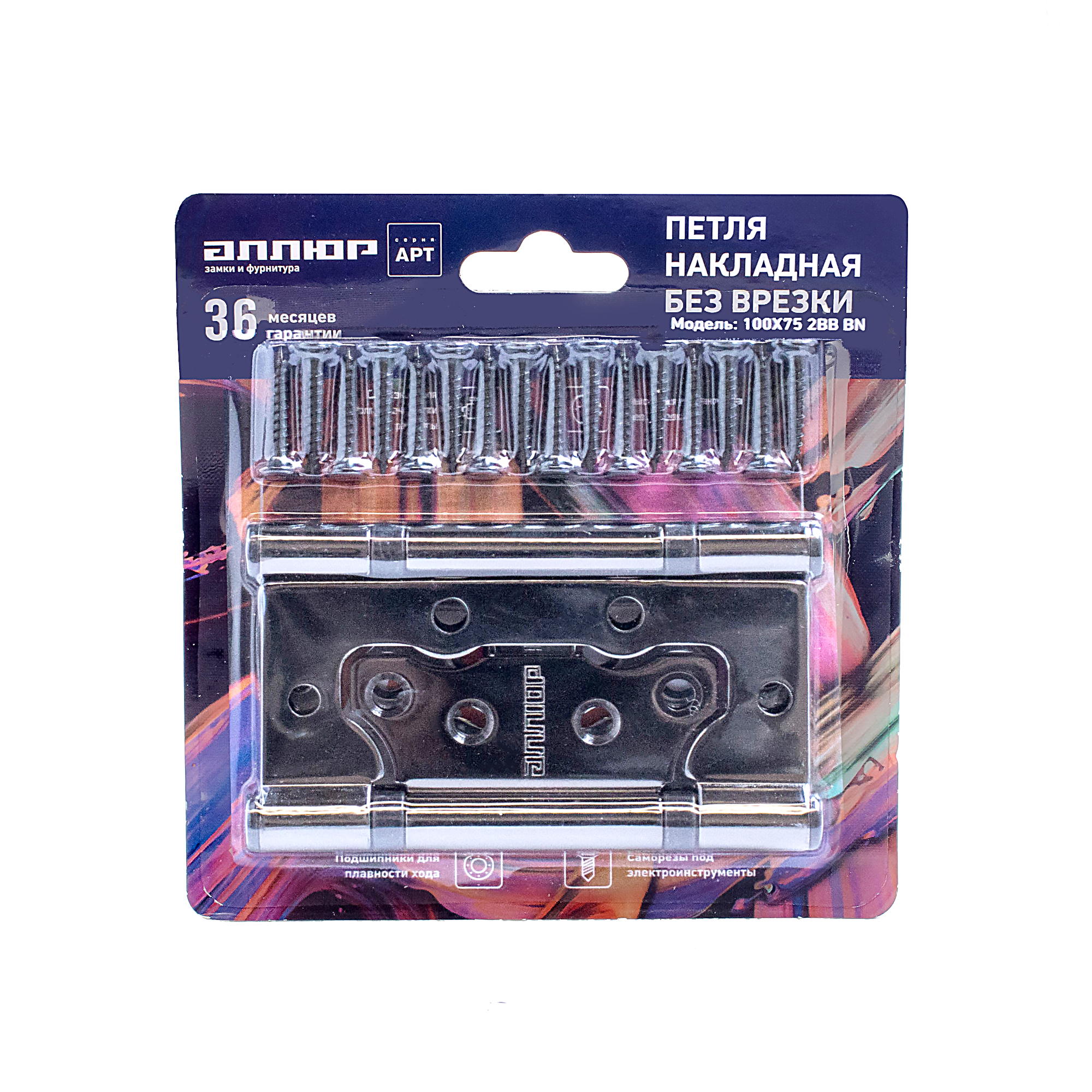 Петля дверная бабочка накладная 100х75 мм АЛЛЮР 2BB 2 штуки предназначена для установки на левые и правые двери. Выполнена из стали с гальваническим покрытием.