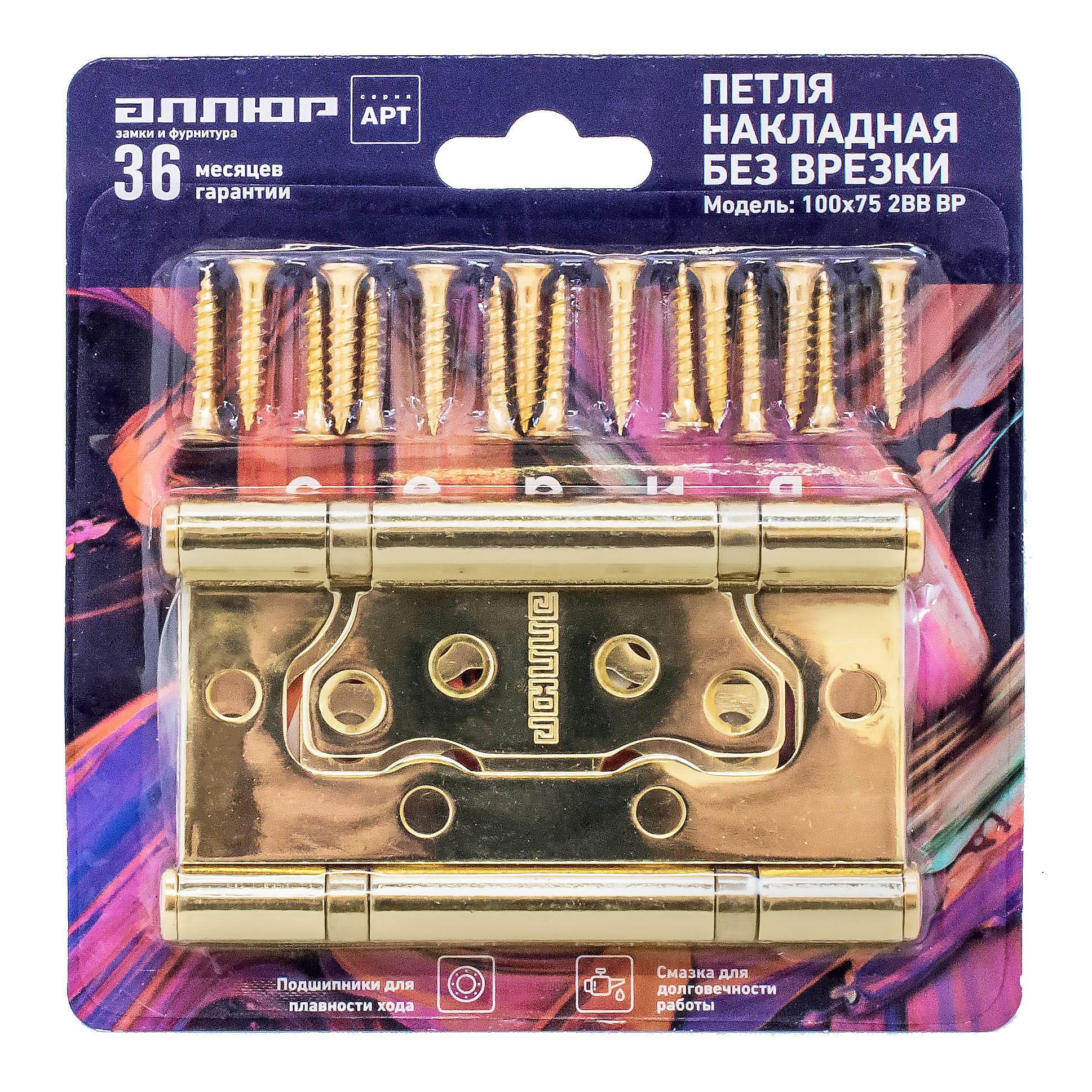 Петля дверная бабочка накладная 100х75 мм АЛЛЮР 2BB SBP латунь 2 штуки предназначена для установки на левые и правые двери. Выполнена из стали с гальваническим покрытием.