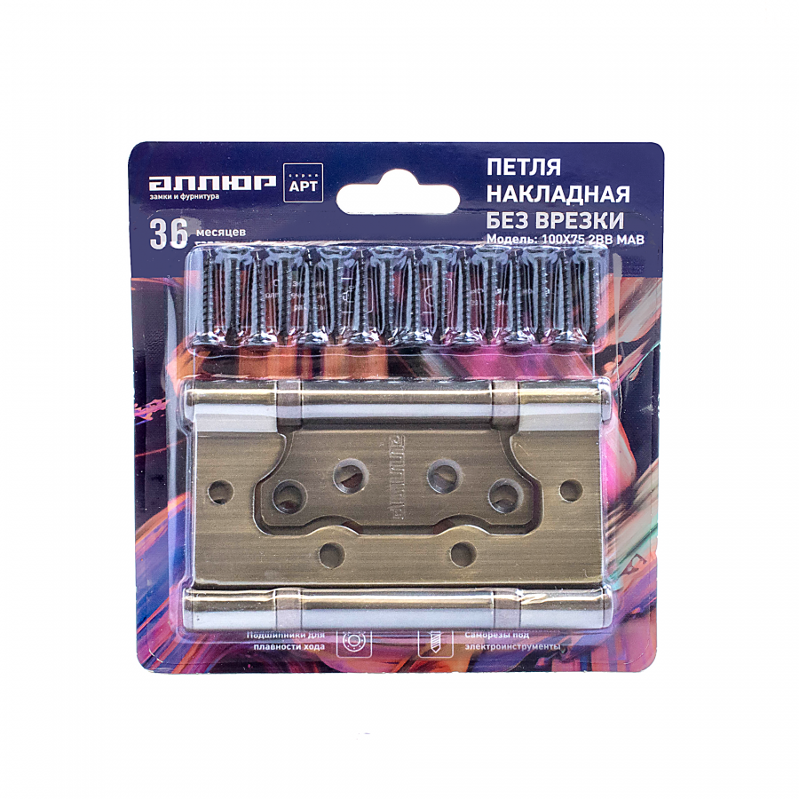 Петля дверная бабочка накладная 100х75 мм АЛЛЮР 2BB 2 штуки предназначена для установки на левые и правые двери. Выполнена из стали с гальваническим покрытием.