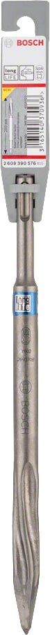 Зубило пиковое SDS-plus 250 мм BOSCH (2609390576) Long Life характеризуется увеличенным на 30% сроком службы и увеличенной на 15% производительностью выемки. Применяется как оснастка для перфораторов с креплением SDS-Plus. Используется при ремонтных и небольших демонтажных работах.