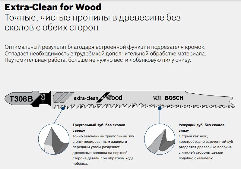 Пилка для электролобзика BOSCH Extra-Clean for Wood T308BO (2608663869) позволяет выполнять очень чистые криволинейные пропилы в древесине. Гладко шлифованные зубья с телом сужающейся формы обеспечивают ровный результат. Кроме того, узкое полотно позволяет делать резкие повороты при криволинейных пропилах. Пропилы без сколов на верхней и нижней поверхностях можно выполнять благодаря двум рядам зубьев, расположенным под разными углами. Полотно HCS (высокоуглеродистая сталь) подходит для пиления мягкой древесины и неабразивных древесных материалов. Геометрия зубьев 2,2XC, мелкий шаг зубьев (2,2 мм) и длина (117 мм) позволяют пилить древесные материалы толщиной 5–50 мм. Для лобзиков с системами крепления с Т-образным хвостовиком.