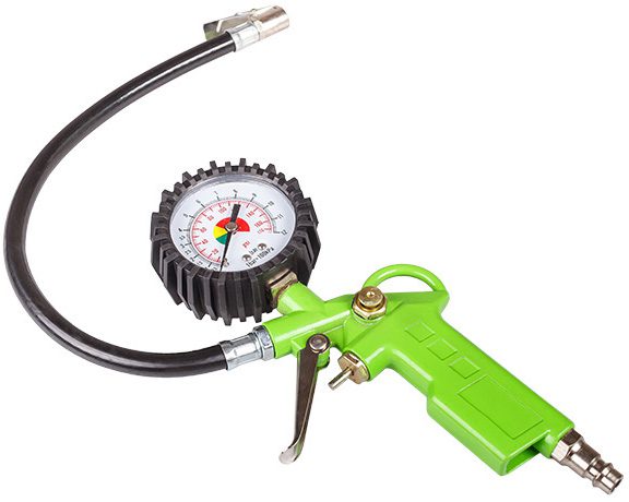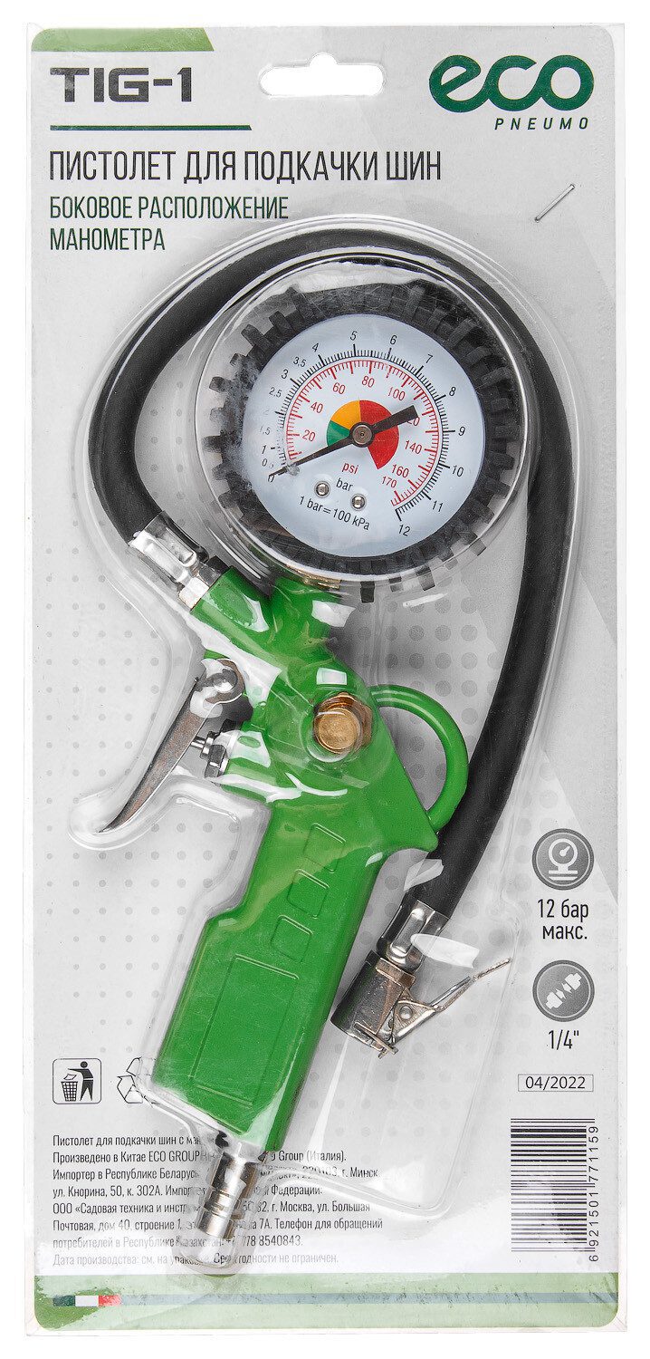 Пистолет для подкачки шин ECO изготовлен из высококачественных материалов, имеет высокую степень надежности и долговечности. Пистолет оснащен манометром для контроля давления в шинах и гибким резиновым шлангом с быстросъемным наконечником для доступа к глубоко утопленным ниппелям и ниппелям, расположенным на внутренних дисках спаренных колес грузовых автомобилей. Манометр способен измерять давление в диапазоне 0-12 bar. Пистолет соединяется с прочим оборудованием посредством внутренней резьбы размером G1/4″. В комплекте с пистолетом поставляется быстросъемное соединение ПАПА.