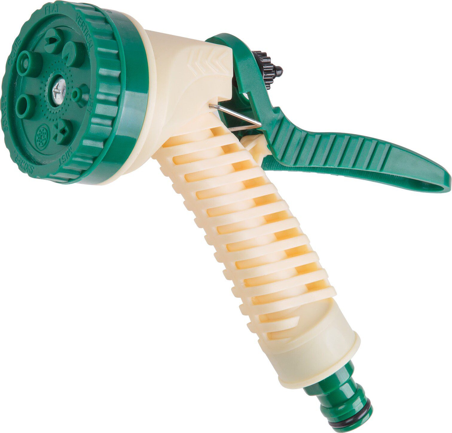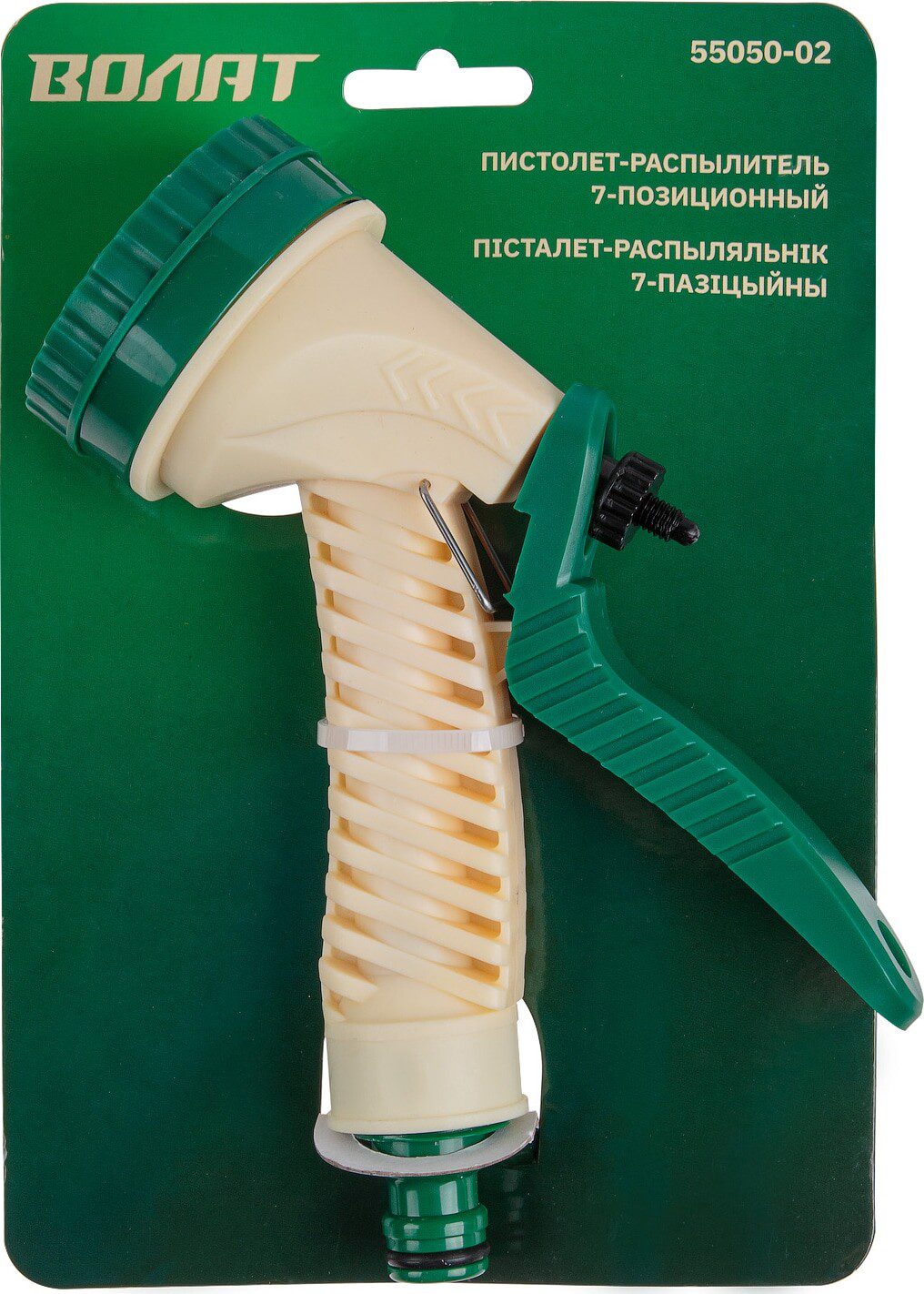 Пистолет-распылитель 7-позиционный ВОЛАТ (55050-02) функционирует в следующих режимах распыления: душ, режим проливного дождя, плоская струя, центр, конус, водяная пыль, вертикальный полив. С помощью специального регулятора можно подобрать наиболее подходящий режим в конкретной ситуации. Корпус изготовлен из экологически чистого пластика. Пистолет крепится к шлангу с помощью универсального соединителя, совместим со всеми элементами аналогичной системы полива.