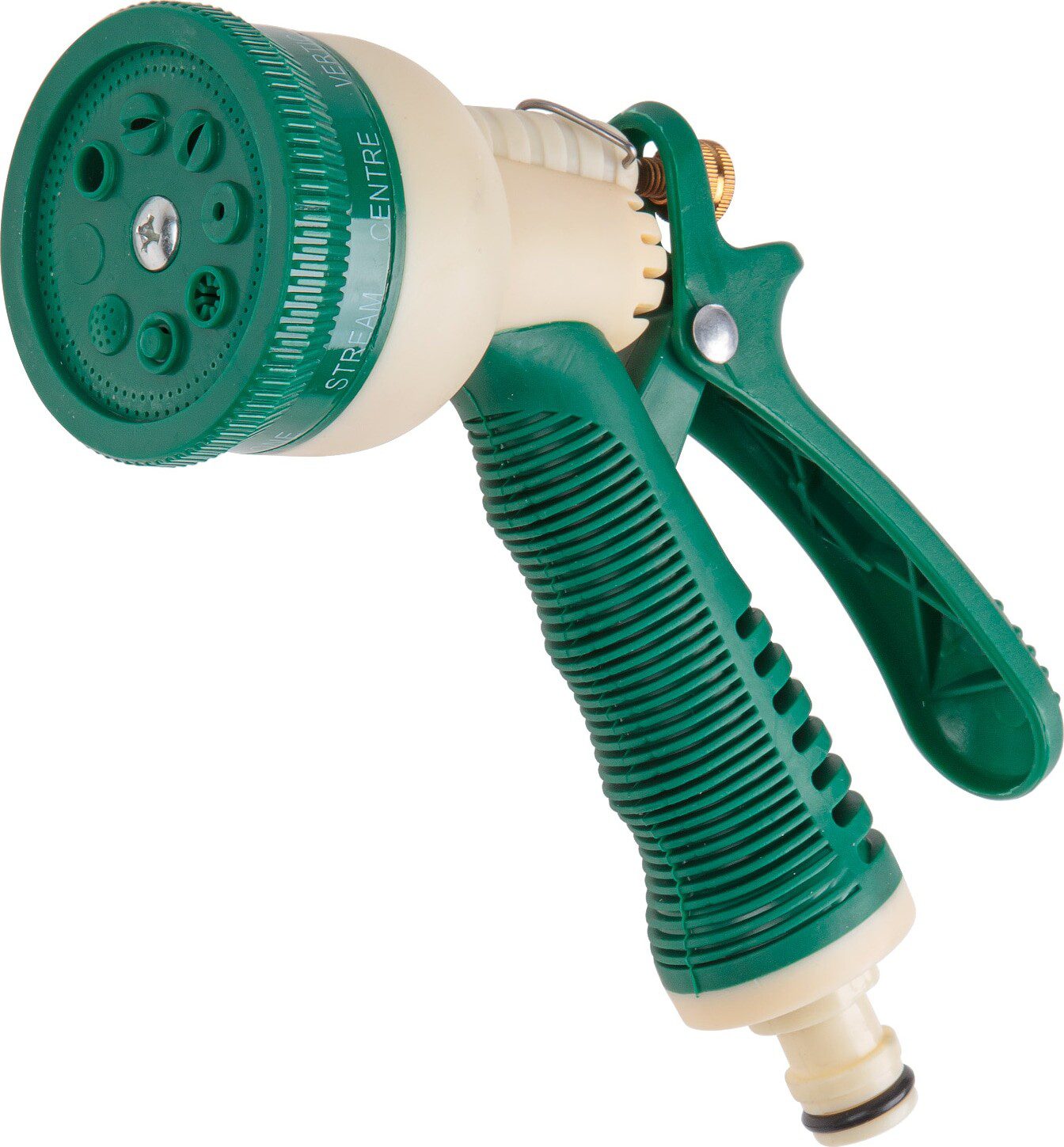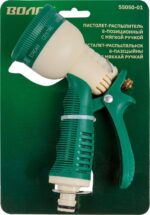 Пистолет-распылитель 8-позиционный с мягкой ручкой ВОЛАТ (55050-01) функционирует в следующих режимах распыления: душ, режим проливного дождя, плоская струя, центр, жесткая струя, конус, водяная пыль, вертикальный полив. С помощью специального регулятора можно подобрать наиболее подходящий режим в конкретной ситуации. Корпус изготовлен из экологически чистого пластика. Удобная ручка из термопластичной резины гарантирует эргономичность и приятный внешний вид инструмента. Пистолет крепится к шлангу с помощью универсального соединителя, совместим со всеми элементами аналогичной системы полива.