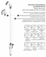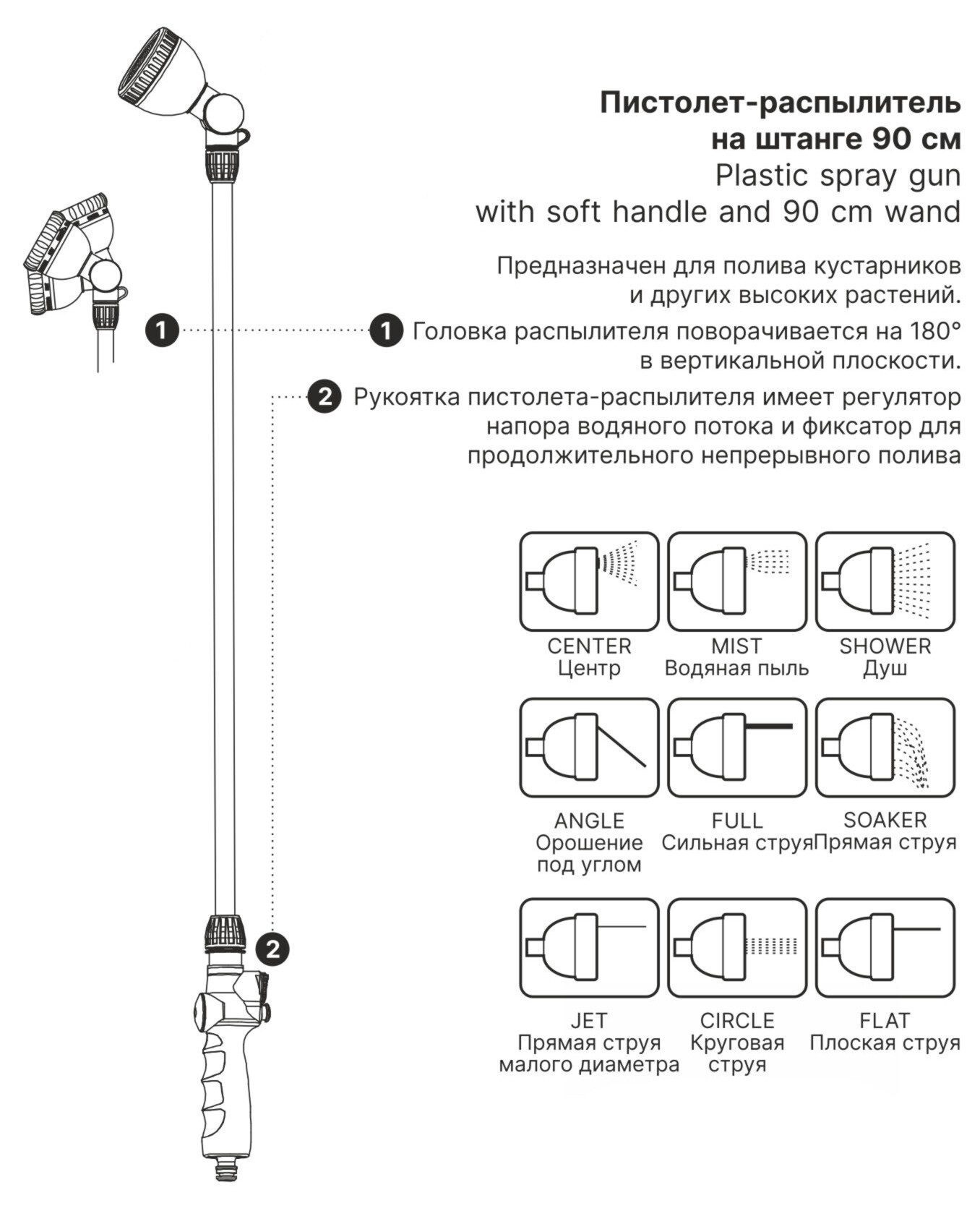 Пистолет-распылитель 9-позиционный на штанге STARTUL GARDEN имеет 9 режимов работы: центральный (center), водяная пыль (mist), душ (shower), под углом (angle), жесткая струя (full), проливной дождь (soaker), прямая струя малого диаметра (jet), круговая струя (circle), плоская струя (flat). Удобен при ручной поливке высоких растений и широких территорий. Пистолет выполнен из пластика и не подвержен коррозии, а также оснащен металлической штангой длиной 90 см. Присоединяется к шлангу через быстросъемную муфту, которая подбирается по диаметру шланга.