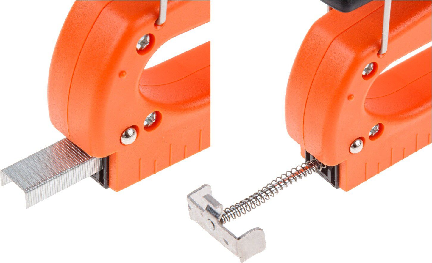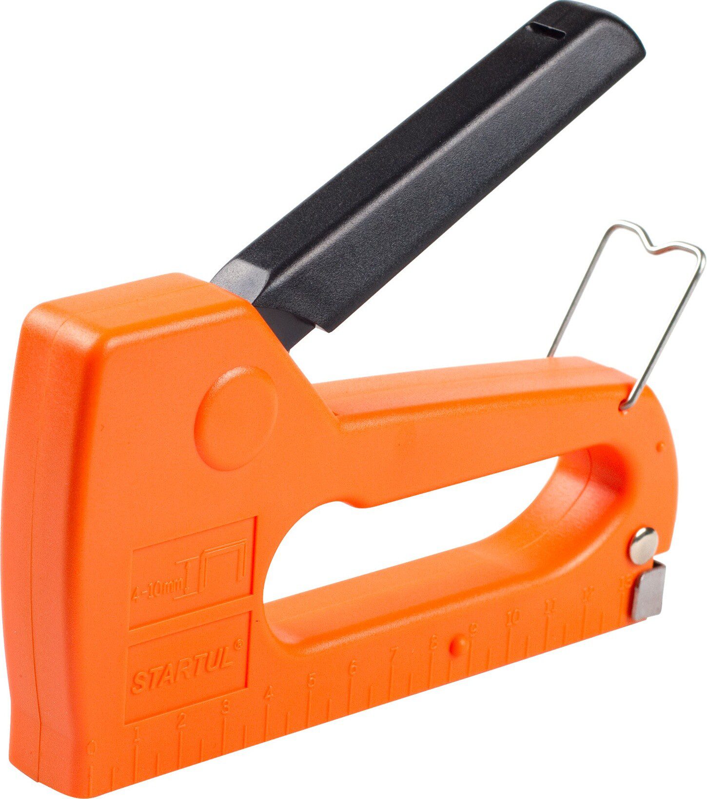 Степлер строительный пластмассовый 4-10 мм STARTUL STANDART (ST4500) используется для моментального присоединения различных материалов к дереву, гипсокартону, пластику. Эргономичная надежная конструкция корпуса позволяет использовать скобы от 4 до 10 мм, тип 53.