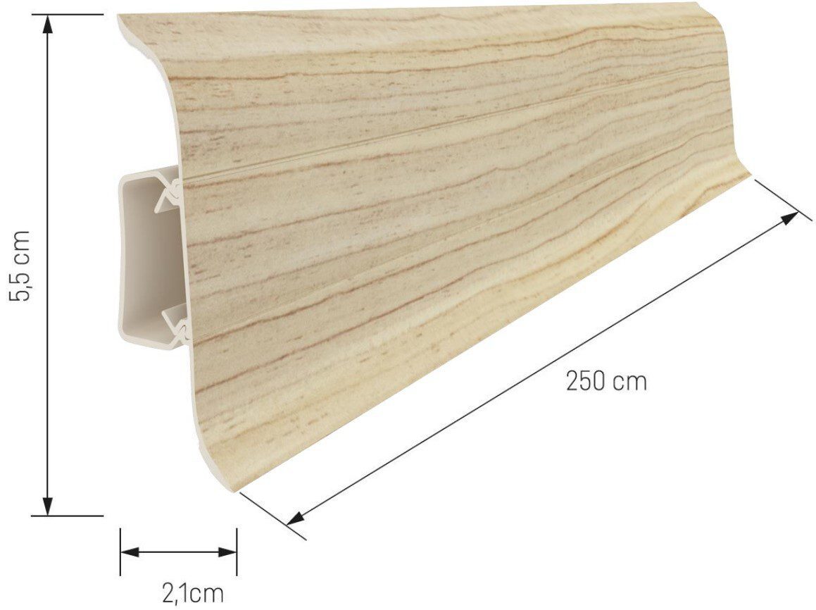 Плинтус напольный ПВХ VOX Profi 2,5 м 588 дуб грейсланд – это практичная и стильная отделка пола. Плинтус VOX отличается своей экологичностью и стабильным качеством. Наличие кабель-канала значительно облегчает проводку телефонного или телевизионного кабеля.