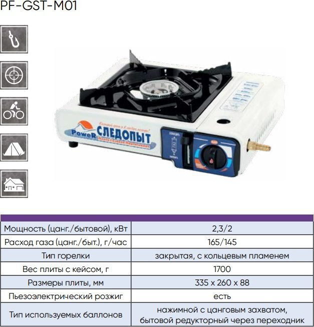 Плита туристическая газовая СЛЕДОПЫТ Power PF-GST-M01 (404532) благодаря особой конструкции газового редуктора, возможности использования этой плиты были существенно расширены. Помимо стандартной схемы использования цанговых газовых баллонов, вы можете подключить плиту к бытовому газовому баллону (при помощи газового переходника). Сама плита оборудована одной горелкой с круговым образованием пламени, имеет пьезоэлектрический розжиг и блок управления подачей газа. Поставляется в пластиковом чемодане (кейсе), который предназначен для транспортировки и хранения плиты.