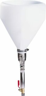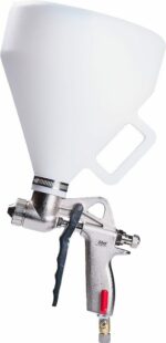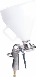 Диаметр сопел регулируется под разные диаметры фракций. Большая скорость работы. Долговечность. При использовании текстурного пистолета отсутствует вероятность отслаивания материала, поскольку смесь более однородна, чем при нанесении шпателем. Комплектация 3 сопла на 4, 6, 8 мм. Объём бачка, 4,5 л. Расход воздуха, расход воздуха 149л/мин. Давление, 3,5 бар. Вес, 2,83 кг.