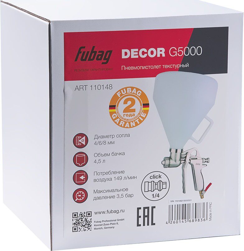 Пневмопистолет для штукатурки FUBAG Decor G5000 (110148) предназначен для нанесения декоративной штукатурки, штукатурки, различных жидких строительных смесей, имеющих включения крошки до 5 мм, некоторых видов жидких обоев.
