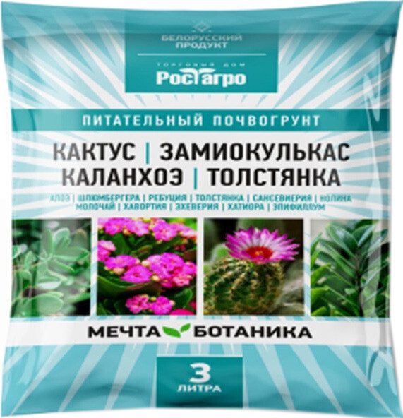 Грунт плодородный МЕЧТА БОТАНИКА Кактус-Замиокулькас-Каланхоэ-Толстянка 3 л — это специально разработанный почвогрунт для цветов: кактус, замиокулькас, каланхоэ, толстянка. Может быть использован на следующих культурах: алоэ, ребуция, сансевиерия, молочай, хавортия, эхеверия. Преимущества:- поможет черенкам быстро укорениться;- стимулирует образование корней;- полноценно питает растение;- ускоряет его рост, правильное развитие;- помогает обильно и долго цвести;- повышает иммунитет, устойчивость цветка к возбудителям болезней.