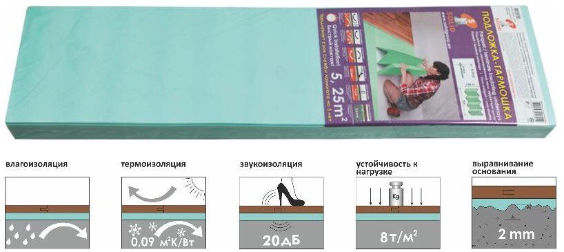 Подложка под ламинат пенополистирол SOLID 1,05х5 м 3 мм зеленый отвечает самым современным требованиям к звуко-, влаго- и термоизоляции помещений. При давлении на подложку она не деформируется и первоначальная форма сохраняется, а так же на протяжении всего срока эксплуатации подложка сохраняет все свои свойства. Подложка имеет антибактерицидные и противогрибковые свойства.