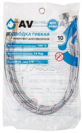 Комплект гибкой подводки для воды иголка м10 – гайка 1/2″ 80 см AV ENGINEERING (AVE21780) предназначен для смесителей и включает в себя два шланга: один – с длинной иголкой м10 и гайкой 1/2″, второй – с короткой иголкой м10 и гайкой 1/2″.