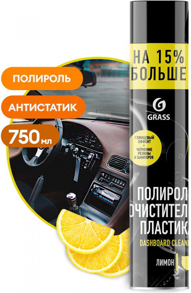 Полироль-очиститель пластика GRASS Dashboard Cleaner Лимон 0,75 л (120107-1) – профессиональный состав для полировки и придания глянцевого блеска пластиковым, кожаным и резиновым элементам отделки салона автомобиля. Может использоваться как смазочный материал в мелких механизмах и для полировки шин. Препятствует появлению жирных пятен и оседанию пыли. Обладает приятным ароматом.