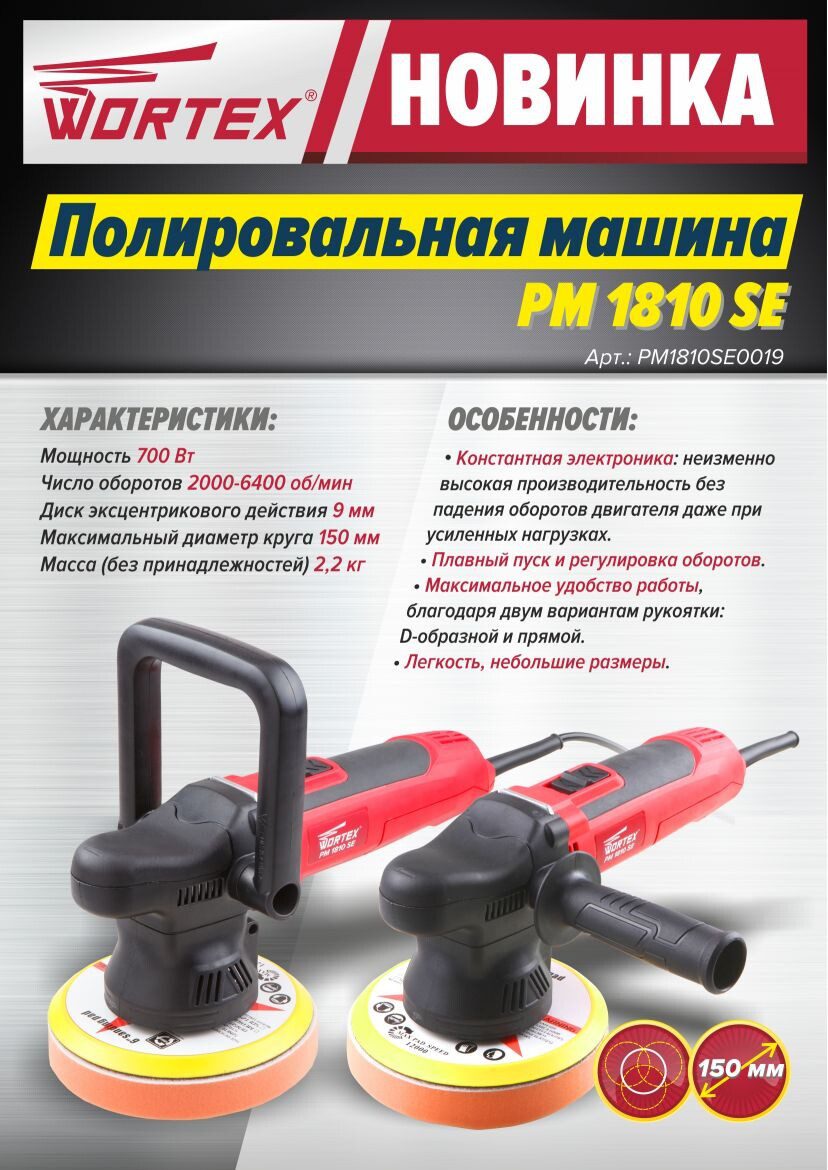 Машина полировальная WORTEX PM 1810 SE (PM1810SE0019) оснащена двигателем 700 Вт, а также константной электроникой, которая позволяет поддерживать постоянные обороты двигателя. Даже при усиленной нагрузке инструмент демонстрирует неизменно высокую производительность работы без падения числа оборотов двигателя. Инструмент оснащен функцией плавного пуска. Электронный регулятор оборотов позволит подобрать подходящий режим для работы с любым материалом. Есть возможность замены дополнительной рукоятки с D-образной на прямую, что сделает управление инструментом максимально удобным для конкретного пользователя. В комплекте имеется шлифтарелка и полировальный круг. Диск эксцентрикового действия 9 мм. Степень защиты: IP20.