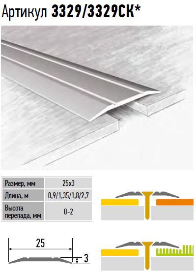 Порог алюминиевый КТМ-2000 3329-02Т 1,8 м золото — плоский профиль шириной 25 мм применяется для соединения стыков между керамической плиткой, линолеумом, ламинатом, паркетом с перепадом поверхностей до 2 мм. Имеет продольное ребро жесткости. Открытая система крепления. Степень нагрузки: для общественных помещений, для офисных помещений, для жилых помещений.