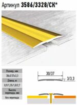 Порог алюминиевый КТМ-2000 3586-02К 0,9 м золото — плоский профиль шириной 30 мм применяется для соединения стыков между напольными покрытиями (керамическая плитка, линолеум, ламинат, паркет). Профиль не имеет продольной жесткости, поэтому не рекомендуется применять на “мягких” покрытиях. Открытая система крепления. Степень нагрузки: для общественных помещений, для офисных помещений, для жилых помещений.