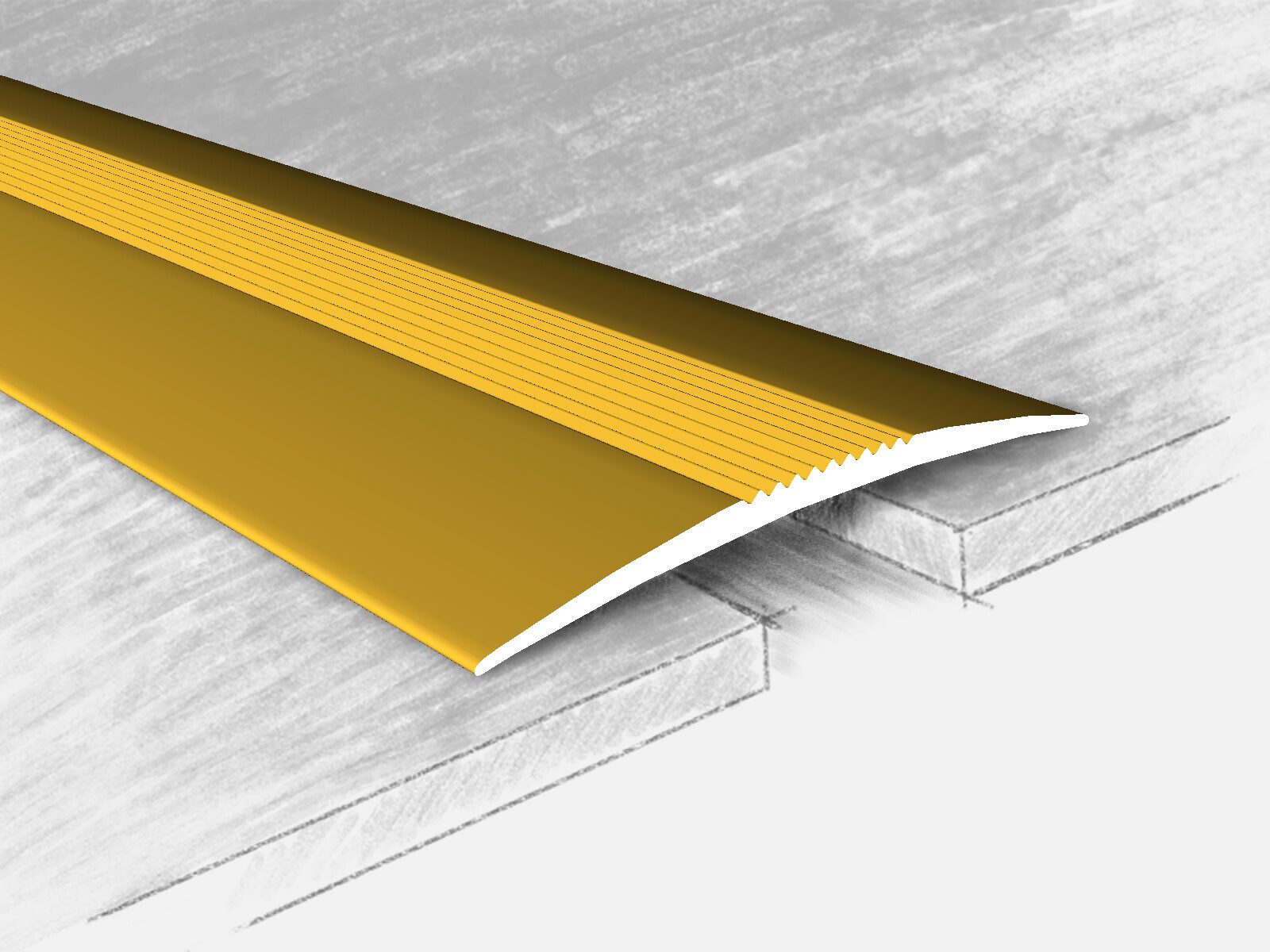 Порог алюминиевый КТМ-2000 60-02Н 1,35 м золото – алюминиевый плоский профиль шириной 50/60 мм применяется для соединения стыков между плиткой, линолеумом, ламинатом, паркетом. Профиль не имеет продольной жесткости. Не рекомендуется применять на мягких покрытиях. Степень нагрузки: для общественных помещений, для офисных помещений, для жилых помещений. Способ крепления: открытый крепеж (дюбель-шуруп).омещений.